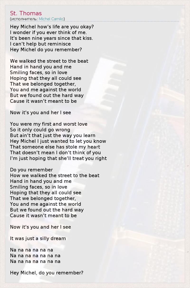 Привет Мишель, как твоя жизнь, все хорошо? Интересно, думаешь лишь ты когда-нибудь обо мне. Прошло 9 лет с того поцелуя. Я не могу не вспоминать о нём... Эй, Мишель, а ты помнишь? Мы шли по улице нога в ногу, Рука в руке, ты и я, С улыбающимися лицами, такие влюбленные, Полные надежд на то, что мы все сможем увидеть, Что мы созданы друг для друга, Мы вдвоём против целого мира... Но мы познали тяжелый путь, Потому что нашим надеждам не суждено было сбыться... А теперь я вижу тебя с ней.... Ты был моей первой и худшей любовью, Поэтому у нас всё могло стать лишь хуже. Но не так ли мы все учимся? Эй, Мишель, я только хочу чтоб ты знал, Что кое-кто ещё украл моё сердце, Но это не значит, что я не думаю о тебе. Я только надеюсь, что она будет хорошо к тебе относиться.... Ты помнишь, Как мы шли по улице нога в ногу, Рука в руке, ты и я, С улыбающимися лицами, такие влюбленные, Полные надежд на то, что мы все сможем увидеть, Что мы созданы друг для друга, Мы вдвоём против целого мира... Но мы познали тяжелый путь, Потому что нашим надеждам не суждено было сбыться... А теперь я вижу тебя с ней.... Это была просто глупая мечта. На-на-на.. На-на-на.. На-на-на.. Эй Мишель, ты помнишь?