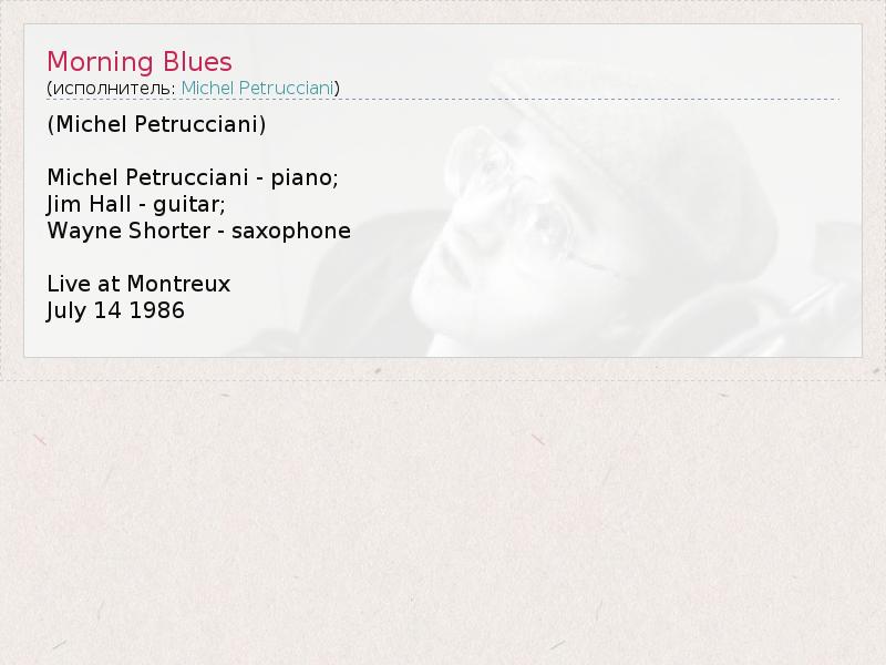 (Michel Petrucciani) Michel Petrucciani - piano; Jim Hall - guitar; Wayne Shorter - saxophone Live at Montreux July 14 1986