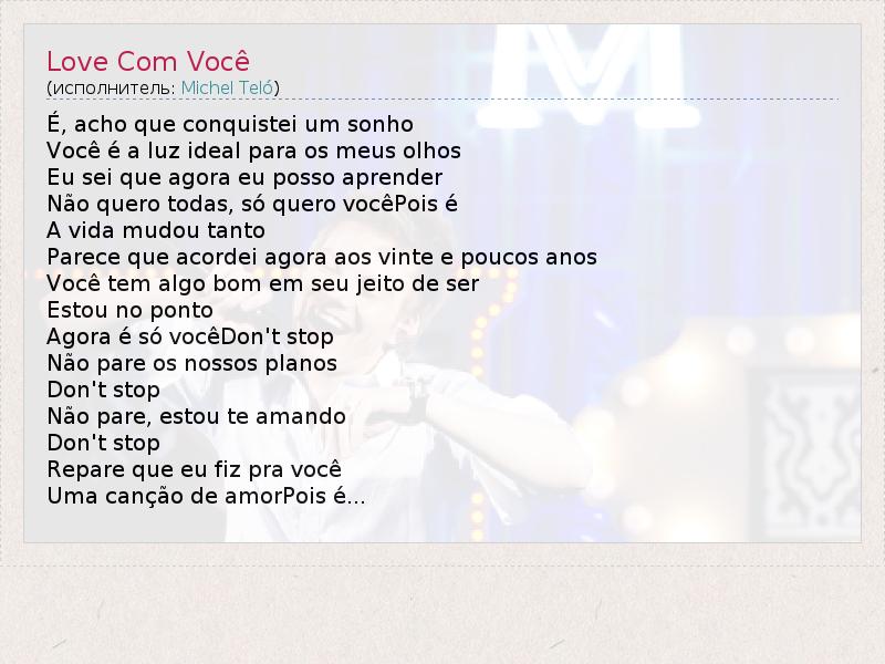 Это интересно:Мише́л Тело́ родился 21 января 1981 года в городе Медианейра, Бразилия, в семье владельцев небольшой пекарни. У него есть два старших брата. Первое выступление Мишела состоялось в 1989 году в школьном хоре, когда он впервые исполнил сольную песню под акустическую гитару.С 1991 года Тело стал играть на аккордеоне и в 1993 году со школьными друзьями они создали группу Guri. В 16 лет... продолжение