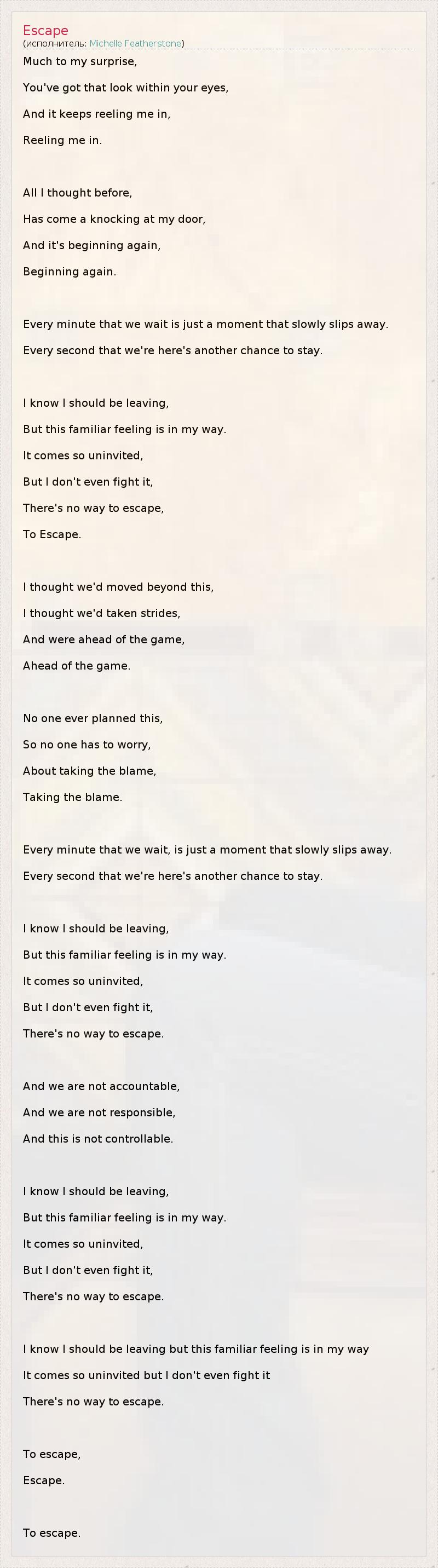 Это интересно:Michelle Featherstone is an British American indie singer-songwriter. Born in Chester, England, and raised in Cambridge, England, Featherstone now resides in Hollywood, California. She began studying piano and composing original music at the age of nine. She has received awards from the Royal Academy of Music for piano and violin and the Bishops Award for voice.CareerBeginningFeatherstone didn't initially intend to pursue a career in music. As an Art History major and Anthropology minor at West Chester University of Pennsylvania in West Chester, Pennsylvania, she found herself managing the Walt Disney-Tishman Collection of African Art after graduation in a somewhat frustrating... продолжение