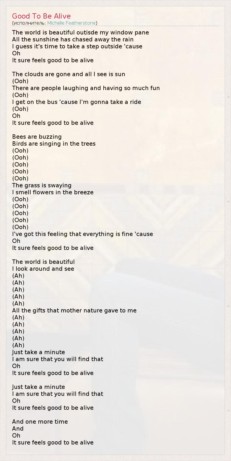 The world is beautiful outisde my window pane All the sunshine has chased away the rain I guess it's time to take a step outside 'cause Oh It sure feels good to be alive The clouds are gone and all I see is sun (Ooh) There are people laughing and having so much fun (Ooh) I get on the bus 'cause I'm gonna take a ride (Ooh) Oh It sure feels good to be alive Bees are buzzing Birds are singing in the trees (Ooh) (Ooh) (Ooh) (Ooh) (Ooh) The grass is swaying I smell flowers in the breeze (Ooh) (Ooh) (Ooh) (Ooh) (Ooh) I've got this feeling that everything is fine 'cause Oh It sure feels good to be alive The world is beautiful I look around and see (Ah) (Ah) (Ah) (Ah) (Ah) All the gifts that mother nature gave to me (Ah) (Ah) (Ah) (Ah) (Ah) Just take a minute I am sure that you will find that Oh It sure feels good to be alive Just take a minute I am sure that you will find that Oh It sure feels good to be alive And one more time And Oh It sure feels good to be alive