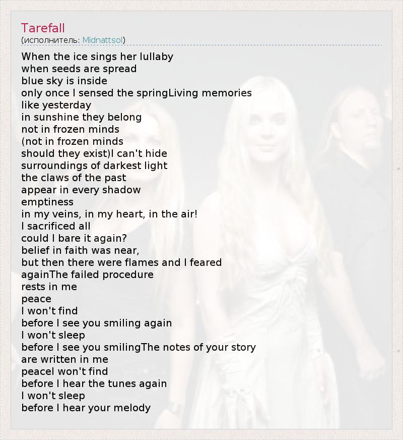 Это интересно:Midnattsol - symphonic metal/folk metal группа, часть музыкантов которой - выходцы из Норвегии, часть - из Германии."Midnattsol" по-норвежски означает "полярный день" (период, когда Солнце не заходит за горизонт дольше 1 суток). Хотя звучание Midnattsol можно охарактеризовать как symphonic metal, музыканты предпочитают говорить, что играют в стиле "Nordic folk metal", поскольку в их музыке присутствуют... продолжение