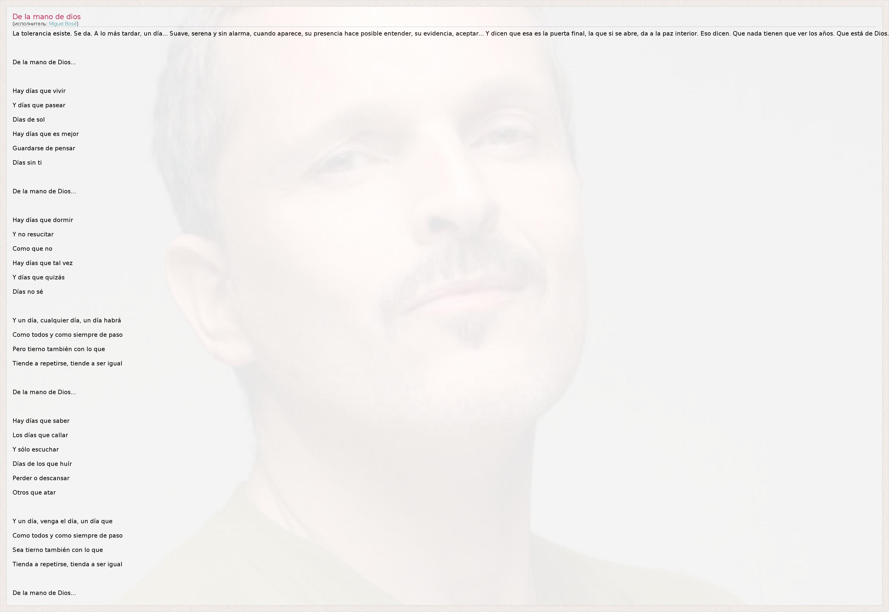 La tolerancia esiste. Se da. A lo más tardar, un día... Suave, serena y sin alarma, cuando aparece, su presencia hace posible entender, su evidencia, aceptar... Y dicen que esa es la puerta final, la que si se abre, da a la paz interior. Eso dicen. Que nada tienen que ver los años. Que está de Dios. De la mano de Dios... Hay días que vivir Y días que pasear Días de sol Hay días que es mejor Guardarse de pensar Días sin ti De la mano de Dios... Hay días que dormir Y no resucitar Como que no Hay días que tal vez Y días que quizás Días no sé Y un día, cualquier día, un día habrá Como todos y como siempre de paso Pero tierno también con lo que Tiende a repetirse, tiende a ser igual De la mano de Dios... Hay días que saber Los días que callar Y sólo escuchar Días de los que huír Perder o descansar Otros que atar Y un día, venga el día, un día que Como todos y como siempre de paso Sea tierno también con lo que Tienda a repetirse, tienda a ser igual De la mano de Dios...