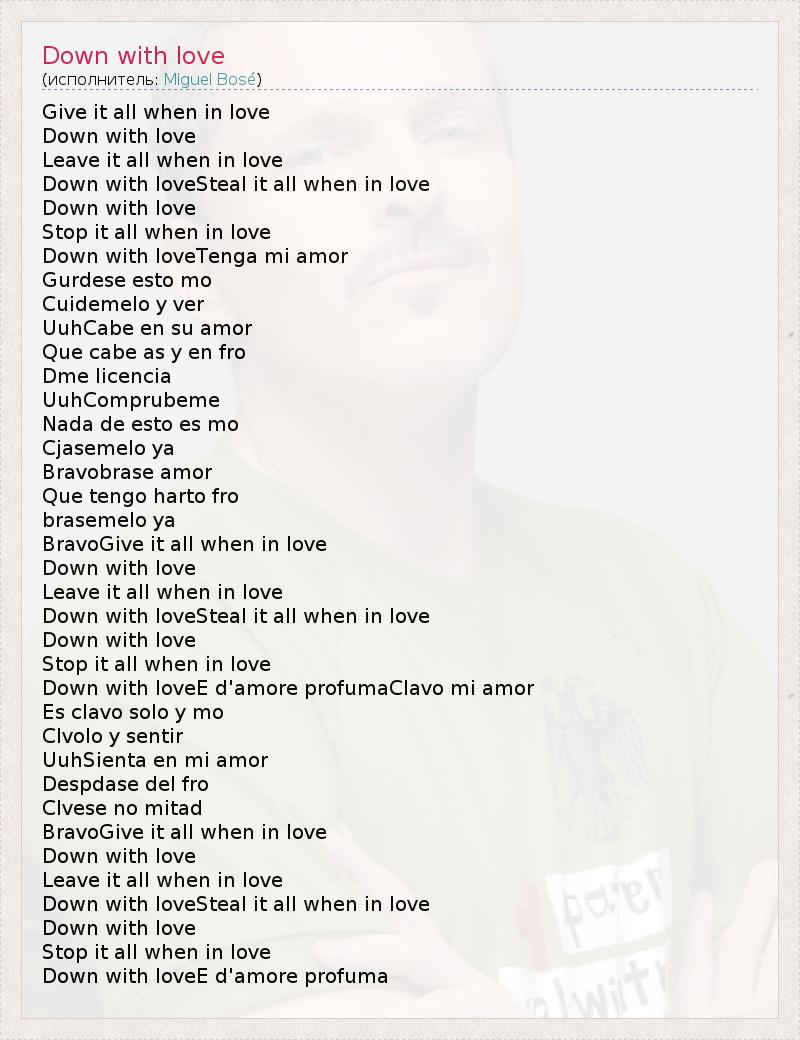 Give it all when in love Down with love Leave it all when in love Down with loveSteal it all when in love Down with love Stop it all when in love Down with loveTenga mi amor Gurdese esto mo Cuidemelo y ver UuhCabe en su amor Que cabe as y en fro Dme licencia UuhComprubeme Nada de esto es mo Cjasemelo ya Bravobrase amor Que tengo harto fro brasemelo ya BravoGive it all when in love Down with love Leave it all when in love Down with loveSteal it all when in love Down with love Stop it all when in love Down with loveE d'amore profumaClavo mi amor Es clavo solo y mo Clvolo y sentir UuhSienta en mi amor Despdase del fro Clvese no mitad BravoGive it all when in love Down with love Leave it all when in love Down with loveSteal it all when in love Down with love Stop it all when in love Down with loveE d'amore profuma