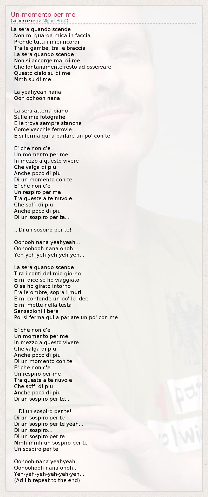 La sera quando scende Non mi guarda mica in faccia Prende tutti i miei ricordi Tra le gambe, tra le braccia La sera quando scende Non si accorge mai di me Che lontanamente resto ad osservare Questo cielo su di me Mmh su di me... La yeahyeah nana Ooh oohooh nana La sera atterra piano Sulle mie fotografie E le trova sempre stanche Come vecchie ferrovie E si ferma qui a parlare un po' con te E' che non c'e Un momento per me In mezzo a questo vivere Che valga di piu Anche poco di piu Di un momento con te E' che non c'e Un respiro per me Tra queste alte nuvole Che soffi di piu Anche poco di piu Di un sospiro per te... ...Di un sospiro per te! Oohooh nana yeahyeah... Oohoohooh nana ohoh... Yeh-yeh-yeh-yeh-yeh-yeh... La sera quando scende Tira i conti del mio giorno E mi dice se ho viaggiato O se ho girato intorno Fra le ombre, sopra i muri E mi confonde un po' le idee E mi mette nella testa Sensazioni libere Poi si ferma qui a parlare un po' con me E' che non c'e Un momento per me In mezzo a questo vivere Che valga di piu Anche poco di piu Di un momento con te E' che non c'e Un respiro per me Tra queste alte nuvole Che soffi di piu Anche poco di piu Di un sospiro per te... ...Di un sospiro per te! Di un sospiro per te Di un sospiro per te yeah... Di un sospiro... Di un sospiro per te Mmh mmh un sospiro per te Un sospiro per te Oohooh nana yeahyeah... Oohoohooh nana ohoh... Yeh-yeh-yeh-yeh-yeh-yeh... (Ad lib repeat to the end)