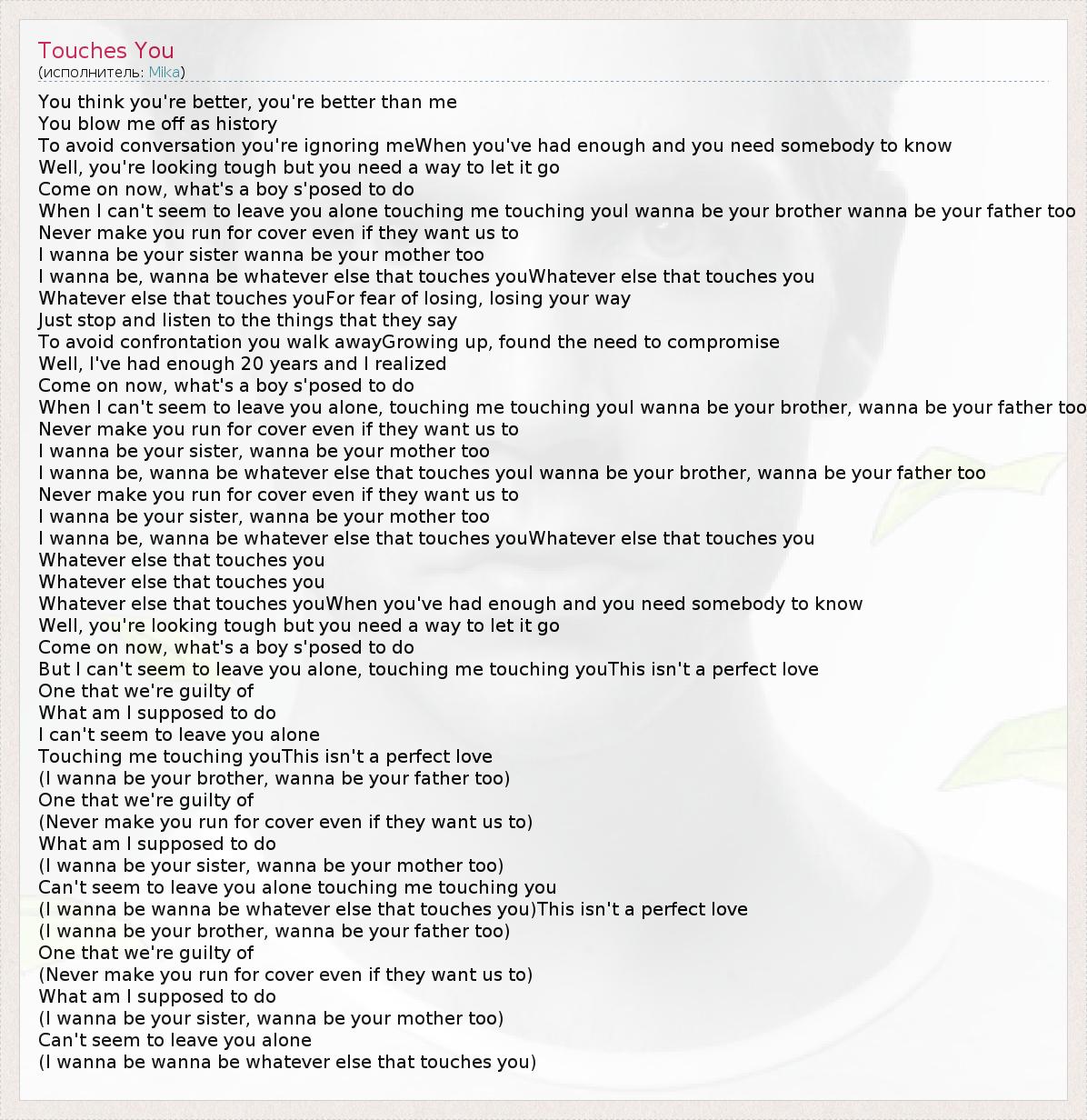When I can't seem to leave you alone touching me touching youI wanna be your brother wanna be your father too
