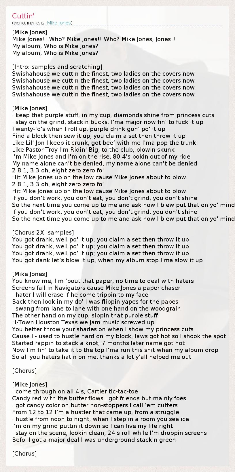 Это интересно:Mike Jones "Позвоним мне, позвони"Who is Mike Jones? Думаю, немногим это стало понятно после прослушивания альбома, а ведь все простым человеческим языком объясняется: Who? Mike Jones! Who? Mike Jones! Майк Джонс это не спаситель планеты, не президент африканской страны и не изобретатель противогаза, Майк Джонс это обычный парень, как вы и я. Он был рожден и выращен в Хьюстоне, как это обычно и бывает... продолжение