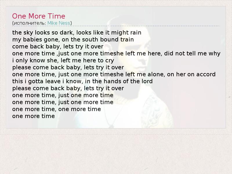 the sky looks so dark, looks like it might rain my babies gone, on the south bound train come back baby, lets try it over one more time ,just one more timeshe left me here, did not tell me why i only know she, left me here to cry please come back baby, lets try it over one more time, just one more timeshe left me alone, on her on accord this i gotta leave i know, in the hands of the lord please come back baby, lets try it over one more time, just one more time one more time, just one more time one more time, one more time one more time