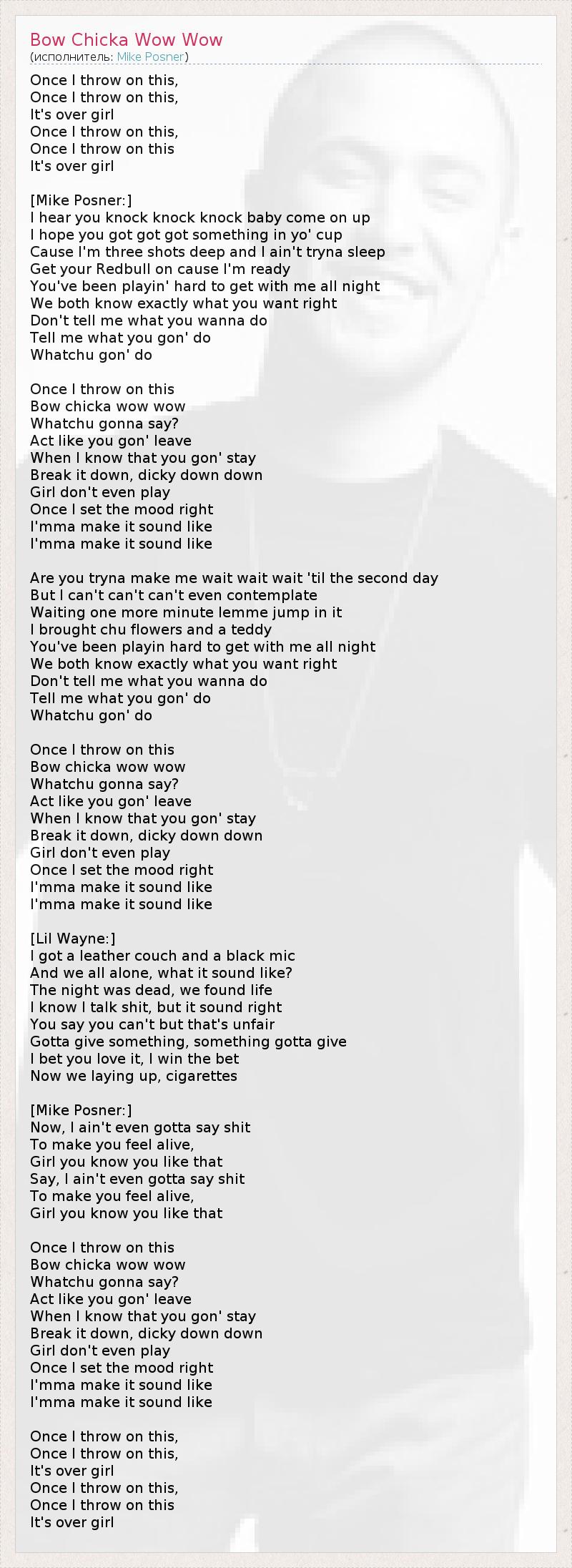 Once I throw on this, Once I throw on this, It's over girl Once I throw on this, Once I throw on this It's over girl [Mike Posner:] I hear you knock knock knock baby come on up I hope you got got got something in yo' cup Cause I'm three shots deep and I ain't tryna sleep Get your Redbull on cause I'm ready You've been playin' hard to get with me all night We both know exactly what you want right Don't tell me what you wanna do Tell me what you gon' do Whatchu gon' do Once I throw on this Bow chicka wow wow Whatchu gonna say? Act like you gon' leave When I know that you gon' stay Break it down, dicky down down Girl don't even play Once I set the mood right I'mma make it sound like I'mma make it sound like Are you tryna make me wait wait wait 'til the second day But I can't can't can't even contemplate Waiting one more minute lemme jump in it I brought chu flowers and a teddy You've been playin hard to get with me all night We both know exactly what you want right Don't tell me what you wanna do Tell me what you gon' do Whatchu gon' do Once I throw on this Bow chicka wow wow Whatchu gonna say? Act like you gon' leave When I know that you gon' stay Break it down, dicky down down Girl don't even play Once I set the mood right I'mma make it sound like I'mma make it sound like [Lil Wayne:] I got a leather couch and a black mic And we all alone, what it sound like? The night was dead, we found life I know I talk shit, but it sound right You say you can't but that's unfair Gotta give something, something gotta give I bet you love it, I win the bet Now we laying up, cigarettes [Mike Posner:] Now, I ain't even gotta say shit To make you feel alive, Girl you know you like that Say, I ain't even gotta say shit To make you feel alive, Girl you know you like that Once I throw on this Bow chicka wow wow Whatchu gonna say? Act like you gon' leave When I know that you gon' stay Break it down, dicky down down Girl don't even play Once I set the mood right I'mma make it sound like I'mma make it sound like Once I throw on this, Once I throw on this, It's over girl Once I throw on this, Once I throw on this It's over girl