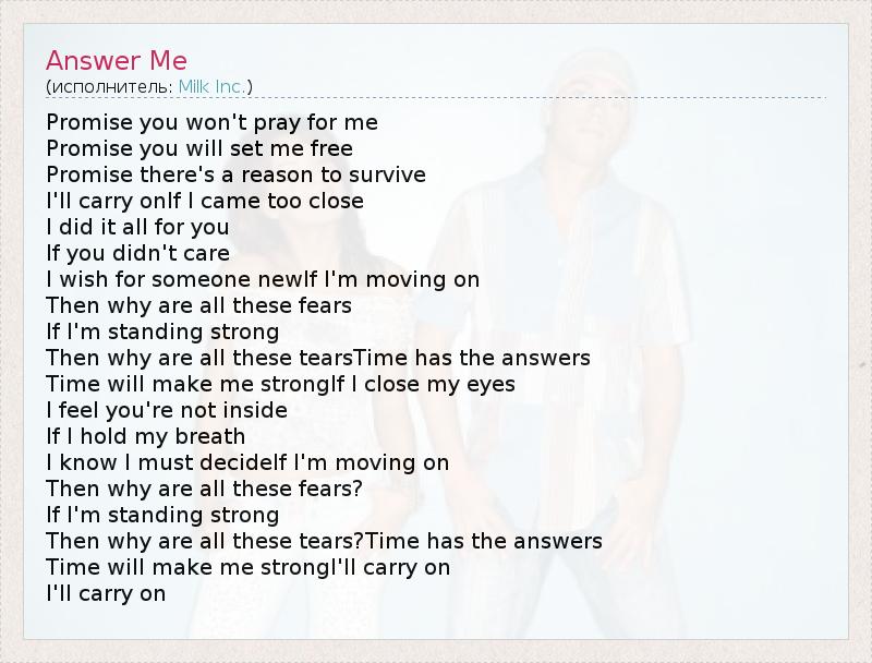 Promise you won't pray for me Promise you will set me free Promise there's a reason to survive I'll carry onIf I came too close I did it all for you If you didn't care I wish for someone newIf I'm moving on Then why are all these fears If I'm standing strong Then why are all these tearsTime has the answers Time will make me strongIf I close my eyes I feel you're not inside If I hold my breath I know I must decideIf I'm moving on Then why are all these fears? If I'm standing strong Then why are all these tears?Time has the answers Time will make me strongI'll carry on I'll carry on