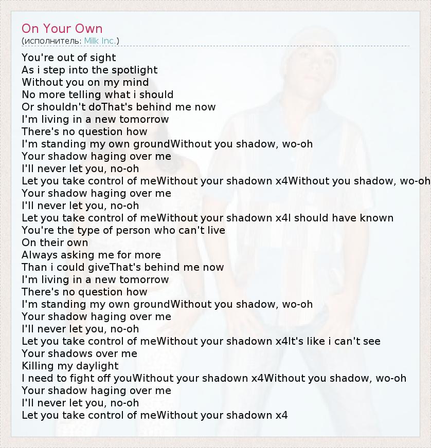 You're out of sight As i step into the spotlight Without you on my mind No more telling what i should Or shouldn't doThat's behind me now I'm living in a new tomorrow There's no question how I'm standing my own groundWithout you shadow, wo-oh Your shadow haging over me I'll never let you, no-oh Let you take control of meWithout your shadown x4Without you shadow, wo-oh Your shadow haging over me I'll never let you, no-oh Let you take control of meWithout your shadown x4I should have known You're the type of person who can't live On their own Always asking me for more Than i could giveThat's behind me now I'm living in a new tomorrow There's no question how I'm standing my own groundWithout you shadow, wo-oh Your shadow haging over me I'll never let you, no-oh Let you take control of meWithout your shadown x4It's like i can't see Your shadows over me Killing my daylight I need to fight off youWithout your shadown x4Without you shadow, wo-oh Your shadow haging over me I'll never let you, no-oh Let you take control of meWithout your shadown x4