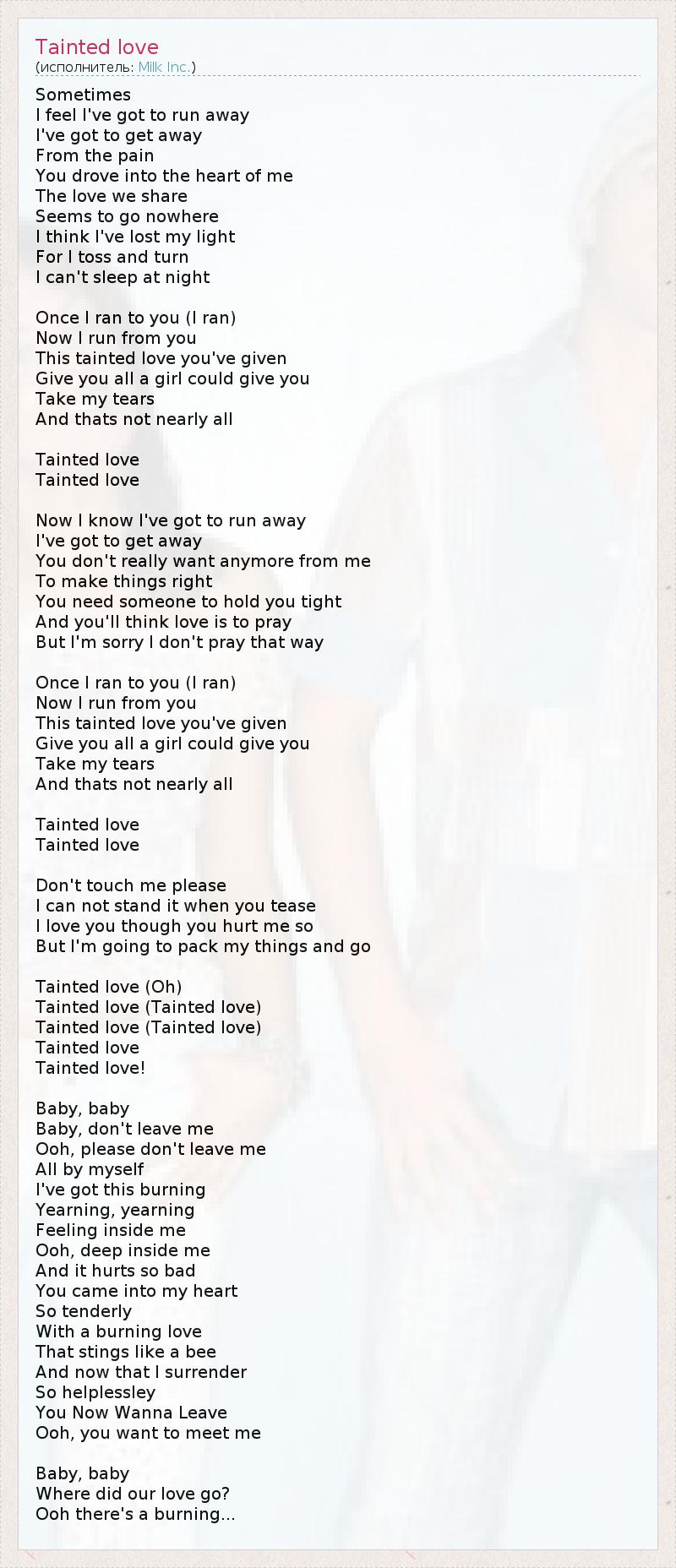 иногда Я чувствую, что надо бежать подальше Я должен уйти От боли Вы ездили в сердце мне Любовь мы разделяем Кажется в никуда Я думаю, что я потерял свой свет Ибо я ворочаться Я не могу спать по ночам После того, как я побежал к вам ( я побежал ) Теперь я бегу от тебя Это Tainted Love вы дали Дай вам все девочку мог бы дать вам Возьмите мои слезы И то далеко не все Tainted Love Tainted Love Теперь я знаю, что я должен убежать Я должен уйти Вы действительно не хотите больше от меня Чтобы сделать все правильно Вам нужно , чтобы кто-то крепко обнять тебя И вы будете думать любовь молиться Но я сожалею, что не молятся , что путь После того, как я побежал к вам ( я побежал ) Теперь я бегу от тебя Это Tainted Love вы дали Дай вам все девочку мог бы дать вам Возьмите мои слезы И то далеко не все Tainted Love Tainted Love Не прикасайся ко мне , пожалуйста, Я не могу стоять, когда вы дразните Я люблю тебя , хотя ты меня так больно Но я собираюсь собрать свои вещи и идти Tainted Love ( О ) Tainted Love ( Tainted Love ) Tainted Love ( Tainted Love ) Tainted Love Tainted Love ! Детка, детка Детка, не оставляй меня Ох, пожалуйста, не оставляй меня Все сам У меня есть этому горению Тоска , тоска Чувствуя внутри меня Ох, глубоко внутри меня И это больно так плохо Вы пришли в моем сердце Так нежно С горящего любовью Это укусы , как пчела И теперь, когда я сдаюсь Так helplessley Вы сейчас хотите оставить Ох, вы хотите встретиться со мной Детка, детка Где наша любовь? Ох есть сжигание ...