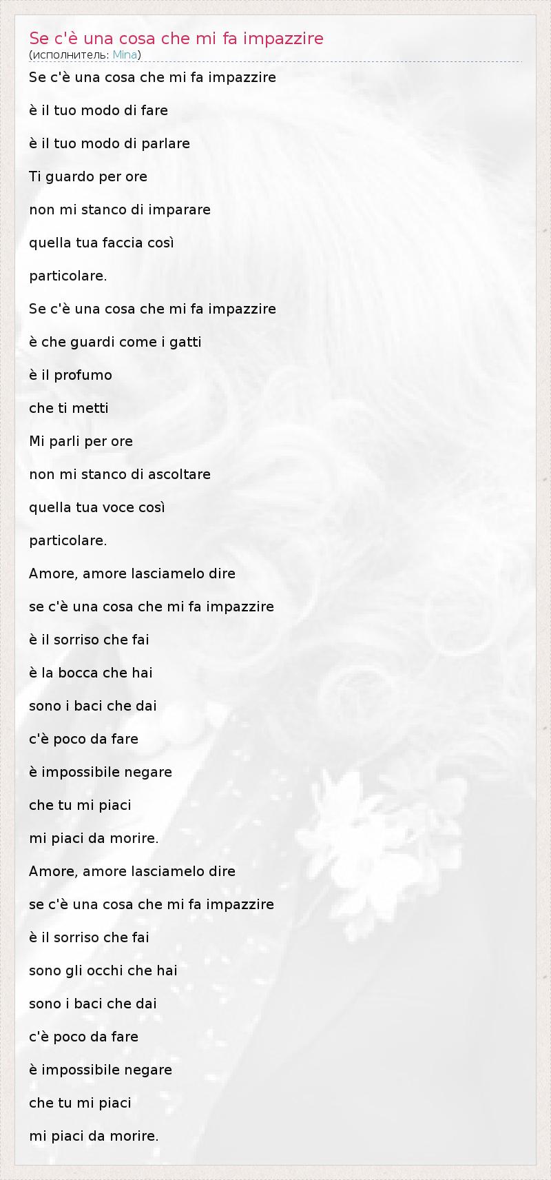 Se c'è una cosa che mi fa impazzire è il tuo modo di fare è il tuo modo di parlare Ti guardo per ore non mi stanco di imparare quella tua faccia così particolare. Se c'è una cosa che mi fa impazzire è che guardi come i gatti è il profumo che ti metti Mi parli per ore non mi stanco di ascoltare quella tua voce così particolare. Amore, amore lasciamelo dire se c'è una cosa che mi fa impazzire è il sorriso che fai è la bocca che hai sono i baci che dai c'è poco da fare è impossibile negare che tu mi piaci mi piaci da morire. Amore, amore lasciamelo dire se c'è una cosa che mi fa impazzire è il sorriso che fai sono gli occhi che hai sono i baci che dai c'è poco da fare è impossibile negare che tu mi piaci mi piaci da morire.