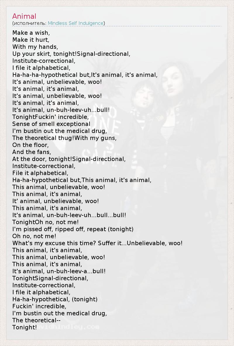 Это интересно:Mindless Self Indulgence (сокращенно — MSI) — американская группа альтернативного рока, образовавшаяся в Нью-Йорке в 1997 году и использующая в своей музыке элементы панка, металла, индастриал и электроники. Три первых альбома обеспечили квартету культовую известность; в числе тех, кто высоко отзывался о нём, были участники System of a Down, Korn, Staind, Sum 41, My Chemical Romance, Rammstein, Mushroomhead.Mindless Self Indulgence образовались... продолжение