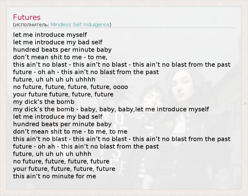 Это интересно:Mindless Self Indulgence (сокращенно — MSI) — американская группа альтернативного рока, образовавшаяся в Нью-Йорке в 1997 году и использующая в своей музыке элементы панка, металла, индастриал и электроники. Три первых альбома обеспечили квартету культовую известность; в числе тех, кто высоко отзывался о нём, были участники System of a Down, Korn, Staind, Sum 41, My Chemical Romance, Rammstein, Mushroomhead.Mindless Self Indulgence образовались... продолжение
