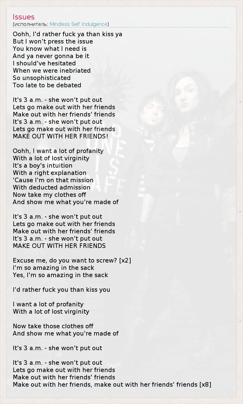 Oohh, I'd rather fuck ya than kiss ya But I won't press the issue You know what I need is And ya never gonna be it I should've hesitated When we were inebriated So unsophisticated Too late to be debated It's 3 a.m. - she won't put out Lets go make out with her friends Make out with her friends' friends It's 3 a.m. - she won't put out Lets go make out with her friends MAKE OUT WITH HER FRIENDS! Oohh, I want a lot of profanity With a lot of lost virginity It's a boy's intuition With a right explanation 'Cause I'm on that mission With deducted admission Now take my clothes off And show me what you're made of It's 3 a.m. - she won't put out Lets go make out with her friends Make out with her friends' friends It's 3 a.m. - she won't put out MAKE OUT WITH HER FRIENDS Excuse me, do you want to screw? [x2] I'm so amazing in the sack Yes, I'm so amazing in the sack I'd rather fuck you than kiss you I want a lot of profanity With a lot of lost virginity Now take those clothes off And show me what you're made of It's 3 a.m. - she won't put out It's 3 a.m. - she won't put out Lets go make out with her friends Make out with her friends' friends Make out with her friends, make out with her friends' friends [x8]
