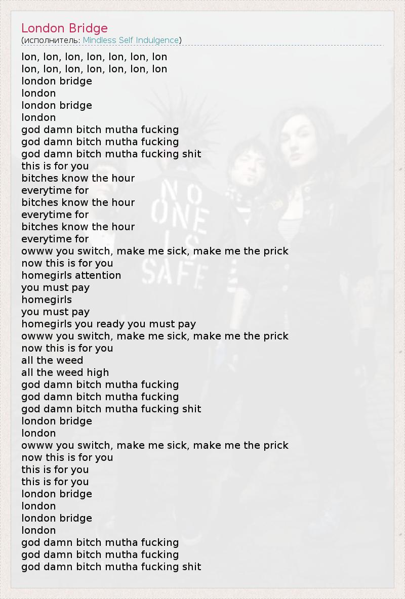 lon, lon, lon, lon, lon, lon, lon lon, lon, lon, lon, lon, lon, lon london bridge london london bridge london god damn bitch mutha fucking god damn bitch mutha fucking god damn bitch mutha fucking shit this is for you bitches know the hour everytime for bitches know the hour everytime for bitches know the hour everytime for owww you switch, make me sick, make me the prick now this is for you homegirls attention you must pay homegirls you must pay homegirls you ready you must pay owww you switch, make me sick, make me the prick now this is for you all the weed all the weed high god damn bitch mutha fucking god damn bitch mutha fucking god damn bitch mutha fucking shit london bridge london owww you switch, make me sick, make me the prick now this is for you this is for you this is for you london bridge london london bridge london god damn bitch mutha fucking god damn bitch mutha fucking god damn bitch mutha fucking shit