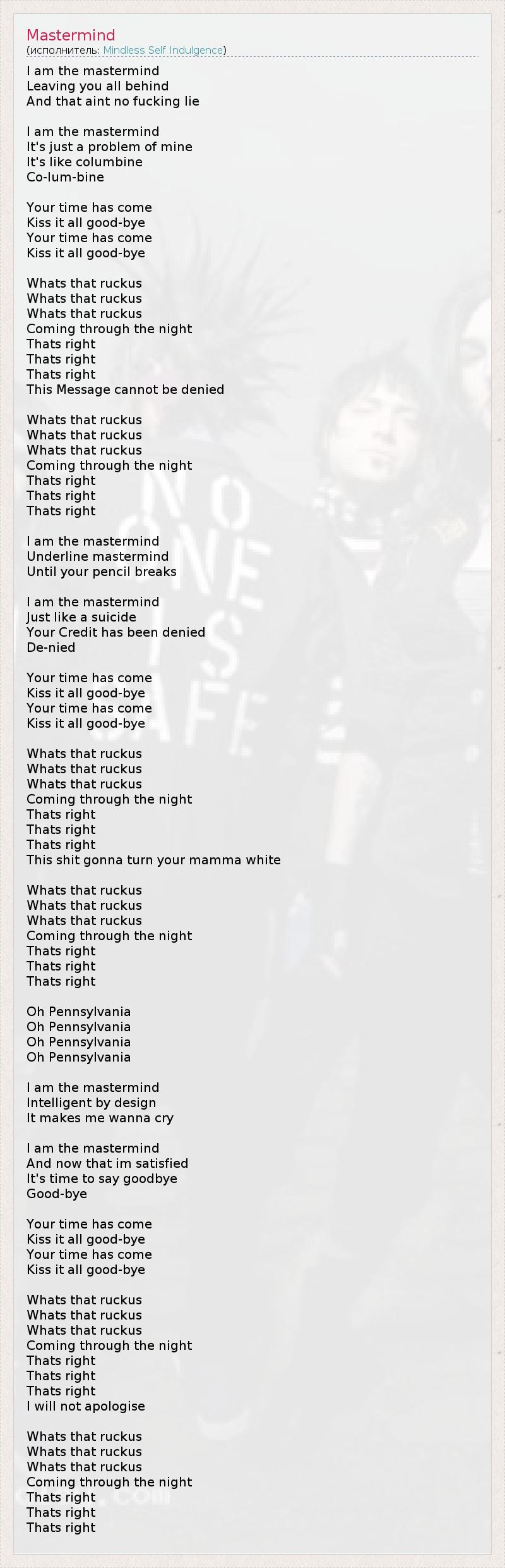 Это интересно:Mindless Self Indulgence (сокращенно — MSI) — американская группа альтернативного рока, образовавшаяся в Нью-Йорке в 1997 году и использующая в своей музыке элементы панка, металла, индастриал и электроники. Три первых альбома обеспечили квартету культовую известность; в числе тех, кто высоко отзывался о нём, были участники System of a Down, Korn, Staind, Sum 41, My Chemical Romance, Rammstein, Mushroomhead.Mindless Self Indulgence образовались... продолжение