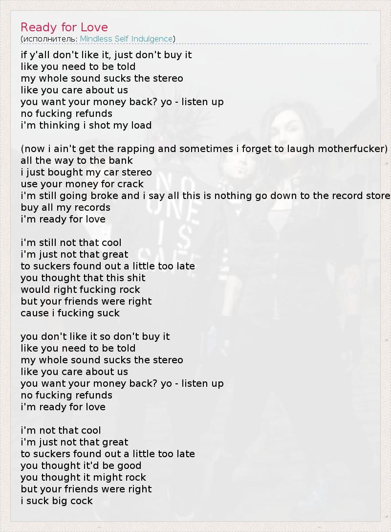 Это интересно:Mindless Self Indulgence (сокращенно — MSI) — американская группа альтернативного рока, образовавшаяся в Нью-Йорке в 1997 году и использующая в своей музыке элементы панка, металла, индастриал и электроники. Три первых альбома обеспечили квартету культовую известность; в числе тех, кто высоко отзывался о нём, были участники System of a Down, Korn, Staind, Sum 41, My Chemical Romance, Rammstein, Mushroomhead.Mindless Self Indulgence образовались... продолжение
