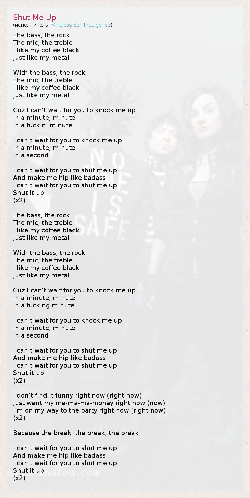 The bass, the rock The mic, the treble I like my coffee black Just like my metal With the bass, the rock The mic, the treble I like my coffee black Just like my metal Cuz I can't wait for you to knock me up In a minute, minute In a fuckin' minute I can't wait for you to knock me up In a minute, minute In a second I can't wait for you to shut me up And make me hip like badass I can't wait for you to shut me up Shut it up (x2) The bass, the rock The mic, the treble I like my coffee black Just like my metal With the bass, the rock The mic, the treble I like my coffee black Just like my metal Cuz I can't wait for you to knock me up In a minute, minute In a fucking minute I can't wait for you to knock me up In a minute, minute In a second I can't wait for you to shut me up And make me hip like badass I can't wait for you to shut me up Shut it up (x2) I don't find it funny right now (right now) Just want my ma-ma-ma-money right now (now) I'm on my way to the party right now (right now) (x2) Because the break, the break, the break I can't wait for you to shut me up And make me hip like badass I can't wait for you to shut me up Shut it up (x2)