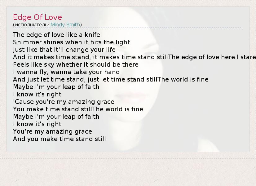 The edge of love like a knife Shimmer shines when it hits the light Just like that it'll change your life And it makes time stand, it makes time stand stillThe edge of love here I stare Feels like sky whether it should be there I wanna fly, wanna take your hand And just let time stand, just let time stand stillThe world is fine Maybe I'm your leap of faith I know it's right 'Cause you're my amazing grace You make time stand stillThe world is fine Maybe I'm your leap of faith I know it's right You're my amazing grace And you make time stand still