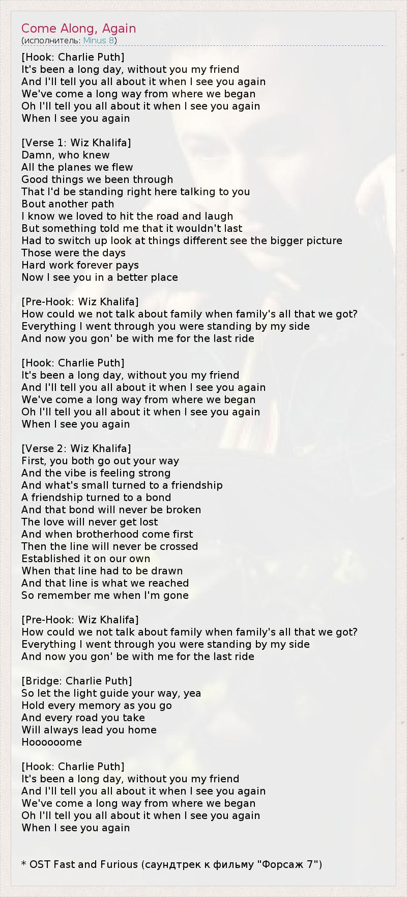 [Hook: Charlie Puth] It's been a long day, without you my friend And I'll tell you all about it when I see you again We've come a long way from where we began Oh I'll tell you all about it when I see you again When I see you again [Verse 1: Wiz Khalifa] Damn, who knew All the planes we flew Good things we been through That I'd be standing right here talking to you Bout another path I know we loved to hit the road and laugh But something told me that it wouldn't last Had to switch up look at things different see the bigger picture Those were the days Hard work forever pays Now I see you in a better place [Pre-Hook: Wiz Khalifa] How could we not talk about family when family's all that we got? Everything I went through you were standing by my side And now you gon' be with me for the last ride [Hook: Charlie Puth] It's been a long day, without you my friend And I'll tell you all about it when I see you again We've come a long way from where we began Oh I'll tell you all about it when I see you again When I see you again [Verse 2: Wiz Khalifa] First, you both go out your way And the vibe is feeling strong And what's small turned to a friendship A friendship turned to a bond And that bond will never be broken The love will never get lost And when brotherhood come first Then the line will never be crossed Established it on our own When that line had to be drawn And that line is what we reached So remember me when I'm gone [Pre-Hook: Wiz Khalifa] How could we not talk about family when family's all that we got? Everything I went through you were standing by my side And now you gon' be with me for the last ride [Bridge: Charlie Puth] So let the light guide your way, yea Hold every memory as you go And every road you take Will always lead you home Hoooooome [Hook: Charlie Puth] It's been a long day, without you my friend And I'll tell you all about it when I see you again We've come a long way from where we began Oh I'll tell you all about it when I see you again When I see you again * OST Fast and Furious (саундтрек к фильму "Форсаж 7")