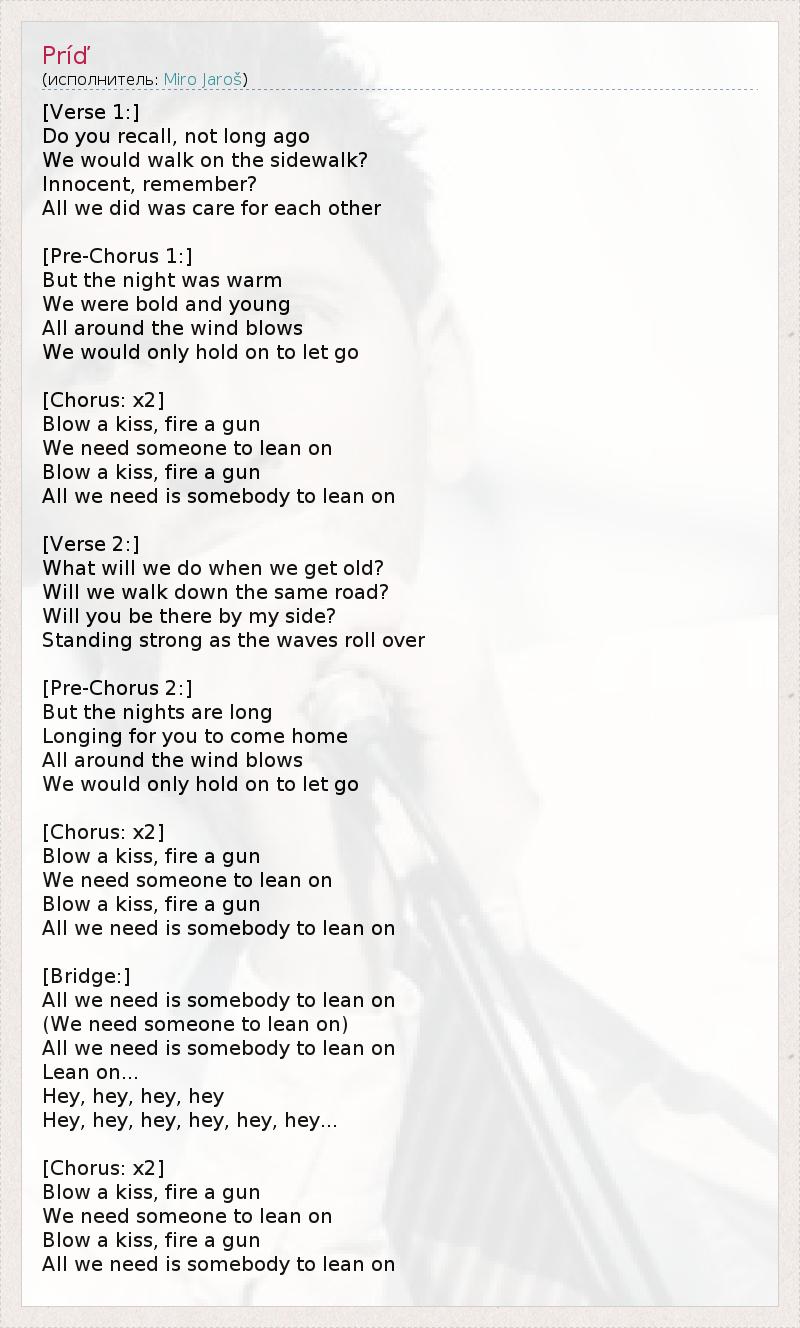 [Verse 1:] Do you recall, not long ago We would walk on the sidewalk? Innocent, remember? All we did was care for each other [Pre-Chorus 1:] But the night was warm We were bold and young All around the wind blows We would only hold on to let go [Chorus: x2] Blow a kiss, fire a gun We need someone to lean on Blow a kiss, fire a gun All we need is somebody to lean on [Verse 2:] What will we do when we get old? Will we walk down the same road? Will you be there by my side? Standing strong as the waves roll over [Pre-Chorus 2:] But the nights are long Longing for you to come home All around the wind blows We would only hold on to let go [Chorus: x2] Blow a kiss, fire a gun We need someone to lean on Blow a kiss, fire a gun All we need is somebody to lean on [Bridge:] All we need is somebody to lean on (We need someone to lean on) All we need is somebody to lean on Lean on... Hey, hey, hey, hey Hey, hey, hey, hey, hey, hey... [Chorus: x2] Blow a kiss, fire a gun We need someone to lean on Blow a kiss, fire a gun All we need is somebody to lean on