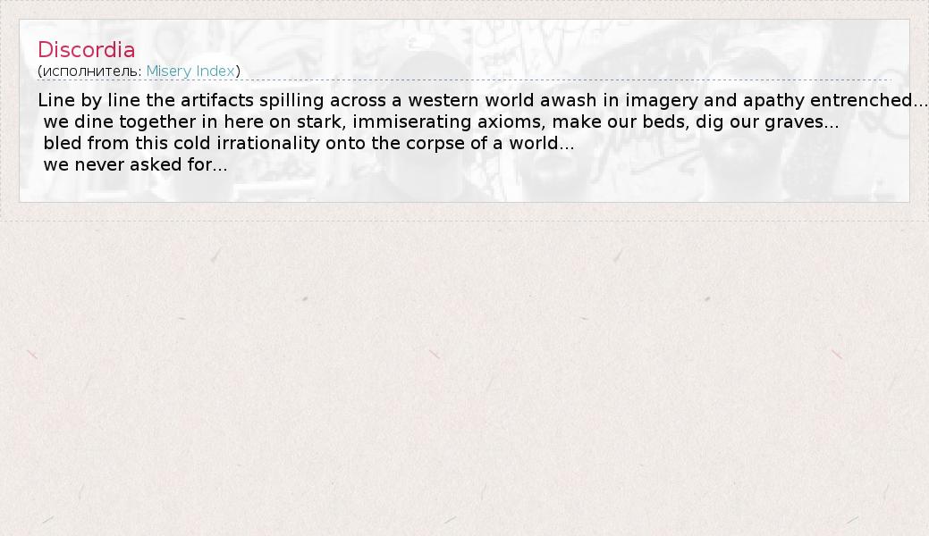 Это интересно:2001 год стал временем, когда четверо "музыкальных террористов", более известных сегодня как Misery Index, решили показать всему миру, что значит настоящий экстремальный метал. Музыка этой группы, впитавшая в себя самую сущность таких экстремальных стилей, как грайндкор и дэт-метал, поражает своей невероятной брутальностью и сложностью исполнения. Однако Misery Index не просто создают тяжелейшую... продолжение