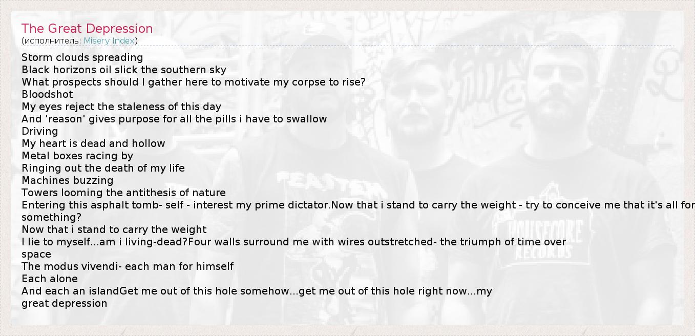 Storm clouds spreading Black horizons oil slick the southern sky What prospects should I gather here to motivate my corpse to rise? Bloodshot My eyes reject the staleness of this day And 'reason' gives purpose for all the pills i have to swallow Driving My heart is dead and hollow Metal boxes racing by Ringing out the death of my life Machines buzzing Towers looming the antithesis of nature Entering this asphalt tomb- self - interest my prime dictator.Now that i stand to carry the weight - try to conceive me that it's all for something? Now that i stand to carry the weight I lie to myself...am i living-dead?Four walls surround me with wires outstretched- the triumph of time over space The modus vivendi- each man for himself Each alone And each an islandGet me out of this hole somehow...get me out of this hole right now...my great depression