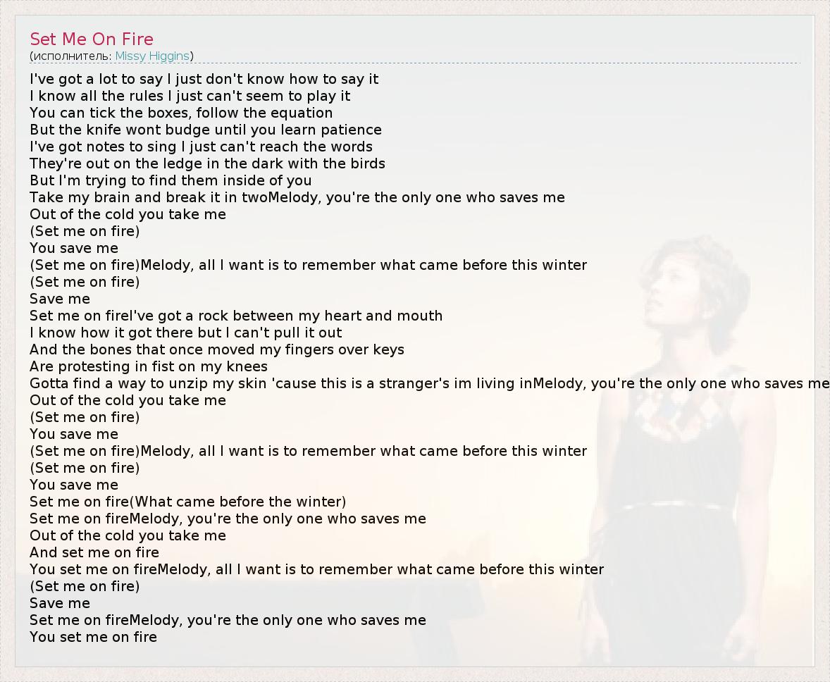 Set me on fireMelody, you're the only one who saves me