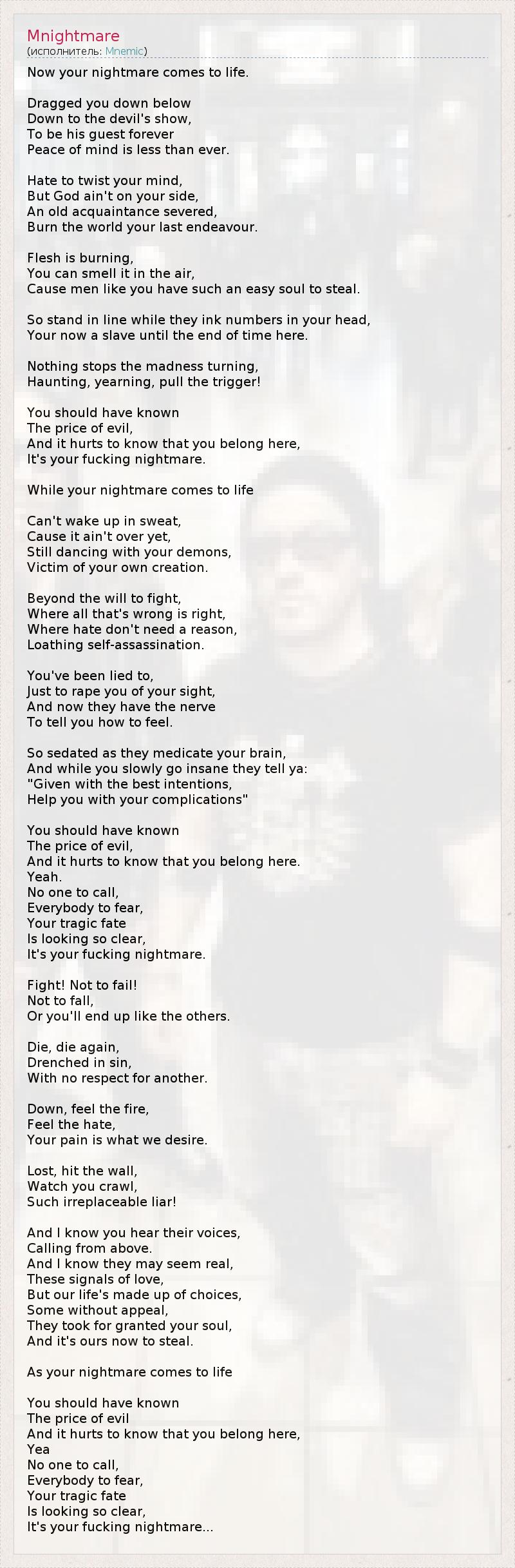 Сейчас твой кошмар оживает... Тебя затянули вниз, Прямо на шоу к дьяволу, Чтобы ты навсегда стал его гостем. Тебе никогда не было так неспокойно на душе. Я не хочу крутить тебе мозги, Но Бог не на твоей стороне. Старая связь разорвана, Спалить мир дотла - твоя последняя попытка. Плоть горит, Ты чувствуешь этот запах в воздухе, Потому что у людей как ты так просто украсть душу. Так стой в ряду, пока тебе не выжгут клеймо на лбу, Теперь ты раб здесь до конца времен. Ничто не может остановить безумие - Навязчивое, непреодолимое... Тяни переключатель! Ты должен был знать Цену зла, И тебе больно осознавать, что ты здесь останешься, Это твой сущий кошмар. Пока твой кошмар оживает... Не можешь проснуться в холодном поту, Потому что это ещё не закончилось. Всё ещё танцуешь с демонами, Своими руками сотворив из себя жертву. Помимо воли к борьбе, Где всё, что ложно - верно, Где на ненависть не нужно причин, Ты ненавидишь идею самоубийства. Тебе врали Лишь для того, чтобы лишить зрения, И сейчас они имеют наглость Указывать тебе, что чувствовать. Успокоение наступает, когда твой мозг накачивают лекарствами. И пока ты медленно становишься безумцем, тебе говорят: "Вооружившись самыми лучшими намерениями, Мы поможем вам с любыми трудностями!" Ты должен был знать Цену зла, И тебе больно осознавать, что ты здесь останешься, Да. Некого звать, Всех нужно бояться. Твоя трагичная судьба Как на ладони - Это твой сущий кошмар. Бороться! Не ошибаться! Не падать, Или ты закончишь, как остальные. Умирай снова и снова, Насквозь пропитанный грехом, Без уважения к остальным. Ниже, почувствуй огонь, Почувствуй ненависть, Твоя боль - всё, что мы желаем. Потерянный, бьёшься об стены, Мы следим за твоим пресмыкательством, Неисправимый лжец! Я знаю, ты слышишь их голоса, Зовущие свыше. Я знаю, что они кажутся реальными, Эти посылы любви. Но наша жизнь - цепочка решений, Иногда абсолютно бессмысленных. Твоя душа была данностью, Ну а теперь мы ее заберём. Как будто твой кошмар оживает... Ты должен был знать Цену зла, И тебе больно осознавать, что ты здесь останешься, Да. Некого звать, Всех нужно бояться. Твоя трагичная судьба Как на ладони - Это твой сущий кошмар...