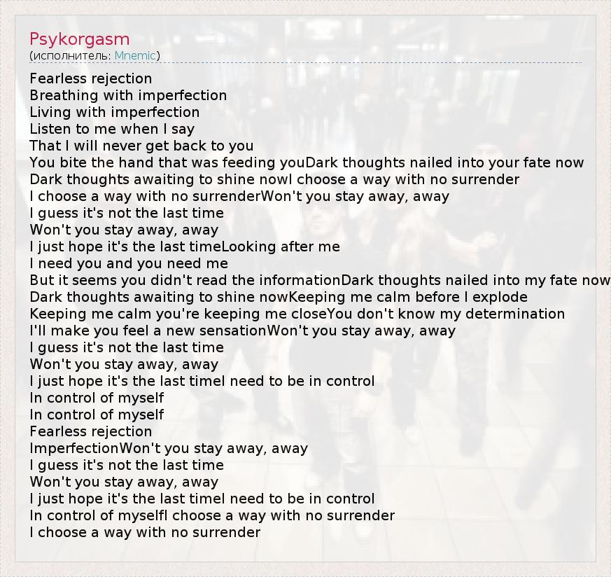 Fearless rejection Breathing with imperfection Living with imperfection Listen to me when I say That I will never get back to you You bite the hand that was feeding youDark thoughts nailed into your fate now Dark thoughts awaiting to shine nowI choose a way with no surrender I choose a way with no surrenderWon't you stay away, away I guess it's not the last time Won't you stay away, away I just hope it's the last timeLooking after me I need you and you need me But it seems you didn't read the informationDark thoughts nailed into my fate now Dark thoughts awaiting to shine nowKeeping me calm before I explode Keeping me calm you're keeping me closeYou don't know my determination I'll make you feel a new sensationWon't you stay away, away I guess it's not the last time Won't you stay away, away I just hope it's the last timeI need to be in control In control of myself In control of myself Fearless rejection ImperfectionWon't you stay away, away I guess it's not the last time Won't you stay away, away I just hope it's the last timeI need to be in control In control of myselfI choose a way with no surrender I choose a way with no surrender