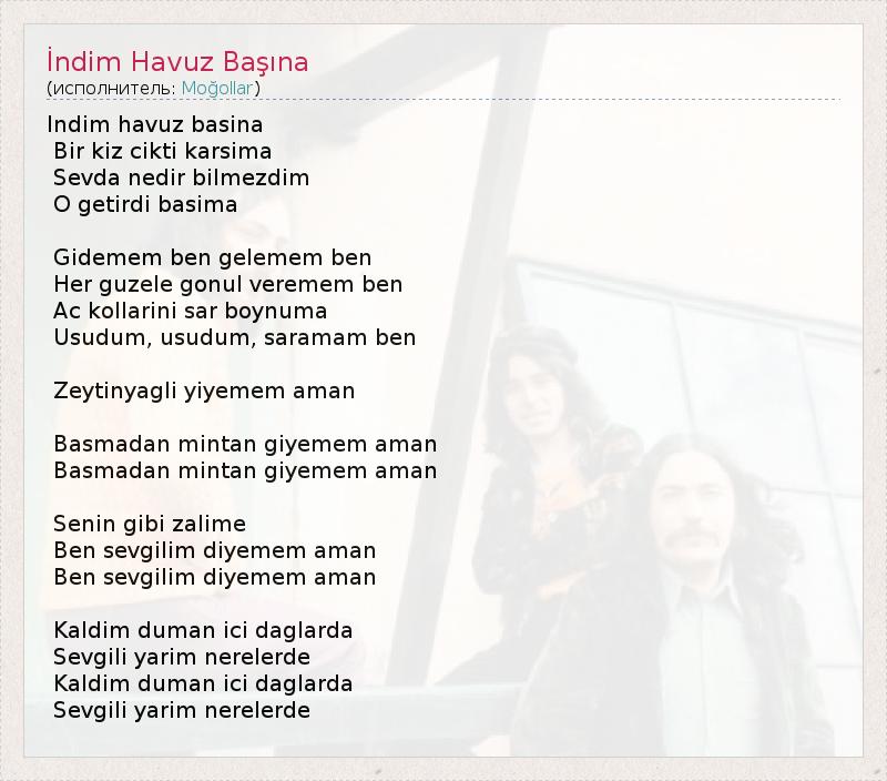 Indim havuz basina Bir kiz cikti karsima Sevda nedir bilmezdim O getirdi basima Gidemem ben gelemem ben Her guzele gonul veremem ben Ac kollarini sar boynuma Usudum, usudum, saramam ben Zeytinyagli yiyemem aman Basmadan mintan giyemem aman Basmadan mintan giyemem aman Senin gibi zalime Ben sevgilim diyemem aman Ben sevgilim diyemem aman Kaldim duman ici daglarda Sevgili yarim nerelerde Kaldim duman ici daglarda Sevgili yarim nerelerde