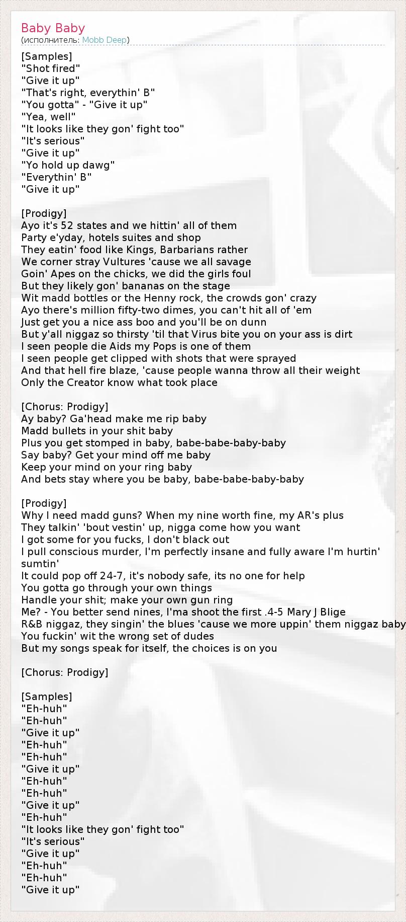 Это интересно:Mobb Deep (чит. Моб Дип) - музыкальный дуэт из Нью-Йорка, района Квинс. Группа состоит из двух участников - Хавока (Havoc) и Продиджи (Prodigy). Стиль дуэта - хардкор рэп. После того, как Mobb Deep выпустили свой второй альбом "The Infamous", о них узнали многие. Их сингл Shook Ones Pt. 2 словно взрывал все чарты. Сейчас парни в разгаре сил, и в ноябре 2011 года они выпустили "Black... продолжение