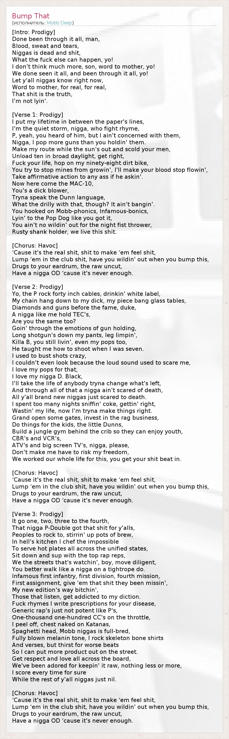 Это интересно:Mobb Deep (чит. Моб Дип) - музыкальный дуэт из Нью-Йорка, района Квинс. Группа состоит из двух участников - Хавока (Havoc) и Продиджи (Prodigy). Стиль дуэта - хардкор рэп. После того, как Mobb Deep выпустили свой второй альбом "The Infamous", о них узнали многие. Их сингл Shook Ones Pt. 2 словно взрывал все чарты. Сейчас парни в разгаре сил, и в ноябре 2011 года они выпустили "Black... продолжение