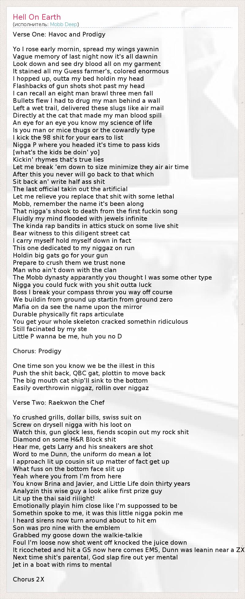 Это интересно:Mobb Deep (чит. Моб Дип) - музыкальный дуэт из Нью-Йорка, района Квинс. Группа состоит из двух участников - Хавока (Havoc) и Продиджи (Prodigy). Стиль дуэта - хардкор рэп. После того, как Mobb Deep выпустили свой второй альбом "The Infamous", о них узнали многие. Их сингл Shook Ones Pt. 2 словно взрывал все чарты. Сейчас парни в разгаре сил, и в ноябре 2011 года они выпустили "Black... продолжение