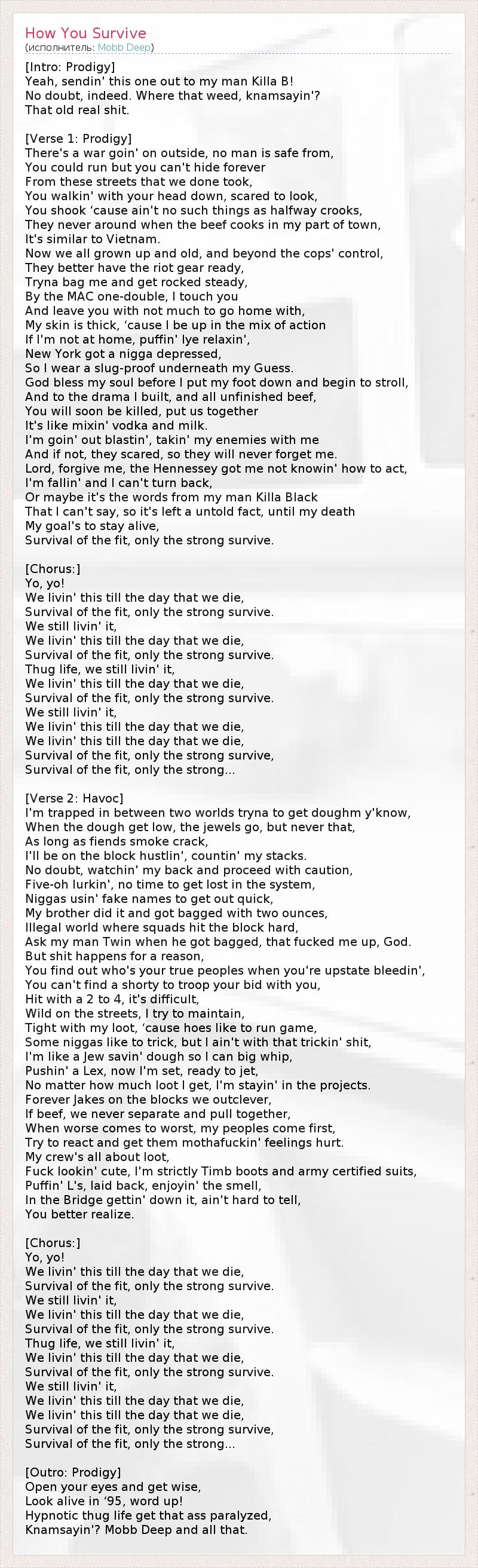 Это интересно:Mobb Deep (чит. Моб Дип) - музыкальный дуэт из Нью-Йорка, района Квинс. Группа состоит из двух участников - Хавока (Havoc) и Продиджи (Prodigy). Стиль дуэта - хардкор рэп. После того, как Mobb Deep выпустили свой второй альбом "The Infamous", о них узнали многие. Их сингл Shook Ones Pt. 2 словно взрывал все чарты. Сейчас парни в разгаре сил, и в ноябре 2011 года они выпустили "Black... продолжение