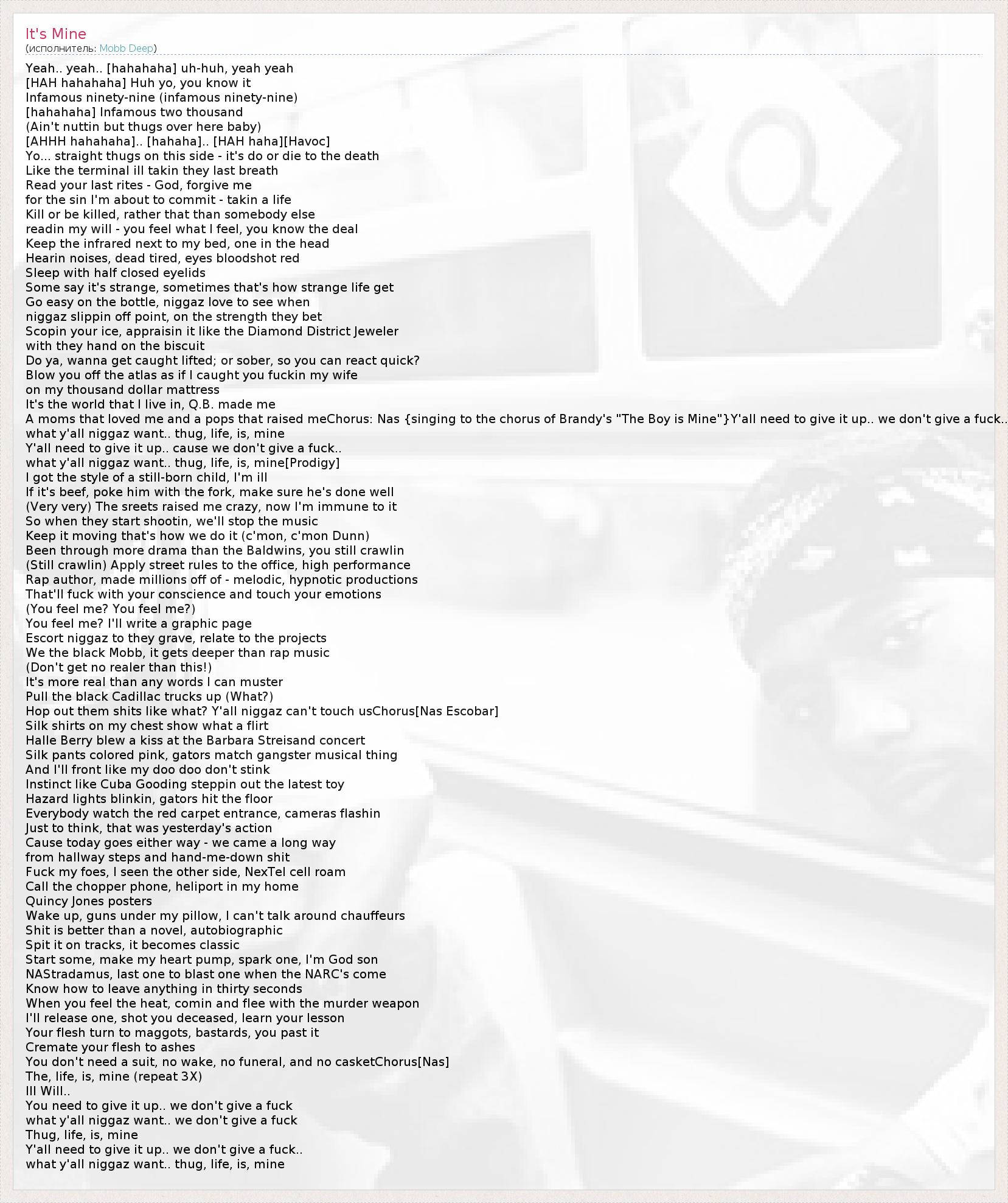 Это интересно:Mobb Deep (чит. Моб Дип) - музыкальный дуэт из Нью-Йорка, района Квинс. Группа состоит из двух участников - Хавока (Havoc) и Продиджи (Prodigy). Стиль дуэта - хардкор рэп. После того, как Mobb Deep выпустили свой второй альбом "The Infamous", о них узнали многие. Их сингл Shook Ones Pt. 2 словно взрывал все чарты. Сейчас парни в разгаре сил, и в ноябре 2011 года они выпустили "Black... продолжение