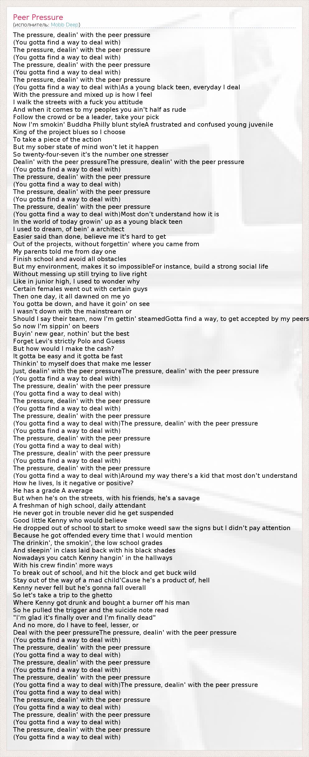 Deal with the peer pressureThe pressure, dealin' with the peer pressure