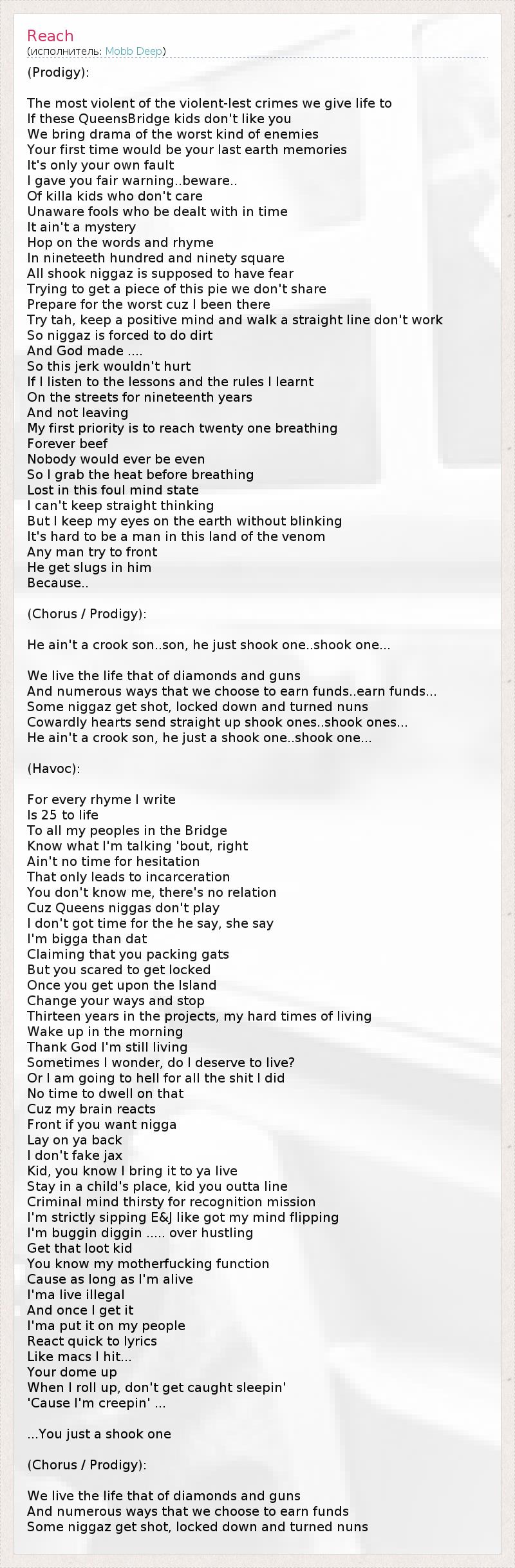 Это интересно:Mobb Deep (чит. Моб Дип) - музыкальный дуэт из Нью-Йорка, района Квинс. Группа состоит из двух участников - Хавока (Havoc) и Продиджи (Prodigy). Стиль дуэта - хардкор рэп. После того, как Mobb Deep выпустили свой второй альбом "The Infamous", о них узнали многие. Их сингл Shook Ones Pt. 2 словно взрывал все чарты. Сейчас парни в разгаре сил, и в ноябре 2011 года они выпустили "Black... продолжение