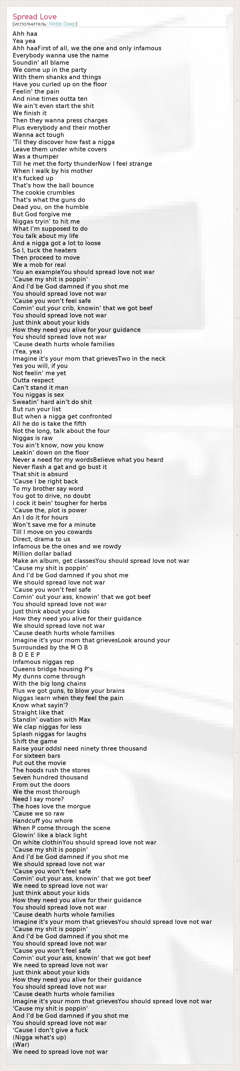 Ahh haa Yea yea Ahh haaFirst of all, we the one and only infamous Everybody wanna use the name Soundin' all blame We come up in the party With them shanks and things Have you curled up on the floor Feelin' the pain And nine times outta ten We ain't even start the shit We finish it Then they wanna press charges Plus everybody and their mother Wanna act tough 'Til they discover how fast a nigga Leave them under white covers Was a thumper Till he met the forty thunderNow I feel strange When I walk by his mother It's fucked up That's how the ball bounce The cookie crumbles That's what the guns do Dead you, on the humble But God forgive me Niggas tryin' to hit me What I'm supposed to do You talk about my life And a nigga got a lot to loose So I, tuck the heaters Then proceed to move We a mob for real You an exampleYou should spread love not war 'Cause my shit is poppin' And I'd be God damned if you shot me You should spread love not war 'Cause you won't feel safe Comin' out your crib, knowin' that we got beef You should spread love not war Just think about your kids How they need you alive for your guidance You should spread love not war 'Cause death hurts whole families (Yea, yea) Imagine it's your mom that grievesTwo in the neck Yes you will, if you Not feelin' me yet Outta respect Can't stand it man You niggas is sex Sweatin' hard ain't do shit But run your list But when a nigga get confronted All he do is take the fifth Not the long, talk about the four Niggas is raw You ain't know, now you know Leakin' down on the floor Never a need for my wordsBelieve what you heard Never flash a gat and go bust it That shit is absurd 'Cause I be right back To my brother say word You got to drive, no doubt I cock it bein' tougher for herbs 'Cause the, plot is power An I do it for hours Won't save me for a minute Till I move on you cowards Direct, drama to us Infamous be the ones and we rowdy Million dollar ballad Make an album, get classesYou should spread love not war 'Cause my shit is poppin' And I'd be God damned if you shot me We should spread love not war 'Cause you won't feel safe Comin' out your ass, knowin' that we got beef You should spread love not war Just think about your kids How they need you alive for their guidance We should spread love not war 'Cause death hurts whole families Imagine it's your mom that grievesLook around your Surrounded by the M O B B D E E P Infamous niggas rep Queens bridge housing P's My dunns come through With the big long chains Plus we got guns, to blow your brains Niggas learn when they feel the pain Know what sayin'? Straight like that Standin' ovation with Max We clap niggas for less Splash niggas for laughs Shift the game Raise your oddsI need ninety three thousand For sixteen bars Put out the movie The hoods rush the stores Seven hundred thousand From out the doors We the most thorough Need I say more? The hoes love the morgue 'Cause we so raw Handcuff you whore When P come through the scene Glowin' like a black light On white clothinYou should spread love not war 'Cause my shit is poppin' And I'd be God damned if you shot me We should spread love not war 'Cause you won't feel safe Comin' out your ass, knowin' that we got beef We need to spread love not war Just think about your kids How they need you alive for their guidance You should spread love not war 'Cause death hurts whole families Imagine it's your mom that grievesYou should spread love not war 'Cause my shit is poppin' And I'd be God damned if you shot me You should spread love not war 'Cause you won't feel safe Comin' out your ass, knowin' that we got beef We need to spread love not war Just think about your kids How they need you alive for their guidance You should spread love not war 'Cause death hurts whole families Imagine it's your mom that grievesYou should spread love not war 'Cause my shit is poppin' And I'd be God damned if you shot me You should spread love not war 'Cause I don't give a fuck (Nigga what's up) (War) We need to spread love not war
