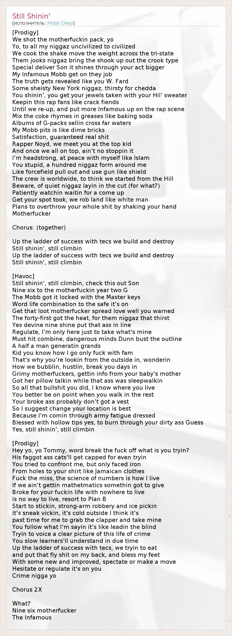 Это интересно:Mobb Deep (чит. Моб Дип) - музыкальный дуэт из Нью-Йорка, района Квинс. Группа состоит из двух участников - Хавока (Havoc) и Продиджи (Prodigy). Стиль дуэта - хардкор рэп. После того, как Mobb Deep выпустили свой второй альбом "The Infamous", о них узнали многие. Их сингл Shook Ones Pt. 2 словно взрывал все чарты. Сейчас парни в разгаре сил, и в ноябре 2011 года они выпустили "Black... продолжение