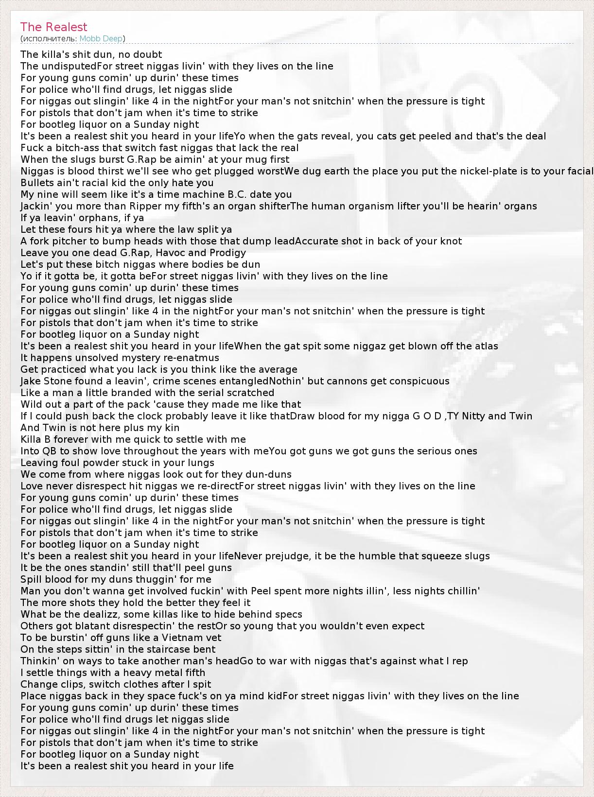 Это интересно:Mobb Deep (чит. Моб Дип) - музыкальный дуэт из Нью-Йорка, района Квинс. Группа состоит из двух участников - Хавока (Havoc) и Продиджи (Prodigy). Стиль дуэта - хардкор рэп. После того, как Mobb Deep выпустили свой второй альбом "The Infamous", о них узнали многие. Их сингл Shook Ones Pt. 2 словно взрывал все чарты. Сейчас парни в разгаре сил, и в ноябре 2011 года они выпустили "Black... продолжение
