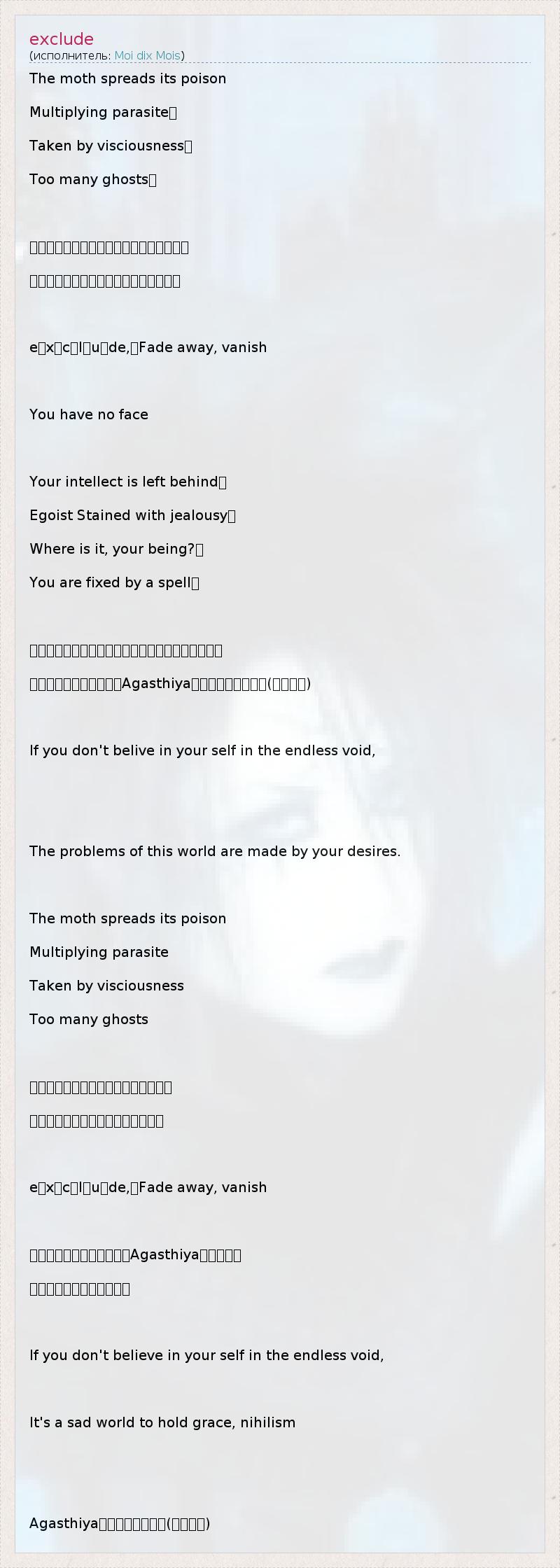 The moth spreads its poison Multiplying parasite Taken by visciousness Too many ghosts 貴方には顔が無い 知性は置き去りにして 死人の戯言など この世には存在しない e x c l u de, Fade away, vanish You have no face Your intellect is left behind Egoist Stained with jealousy Where is it, your being? You are fixed by a spell 悪意を抱き 認めても その虚ろな夢 空白のまま 存在すら気づかれない Agasthiyaが描く 破滅の戯曲(シナリオ) If you don't belive in your self in the endless void, The problems of this world are made by your desires. The moth spreads its poison Multiplying parasite Taken by visciousness Too many ghosts 貴方には何がある 毒牙を磨く事しか 死人は棺の中で安らかに眠ればいい e x c l u de, Fade away, vanish 悪夢の中 逃げ延びても Agasthiyaはそう嘲り 死ぬまで抱いて眠るがいい If you don't believe in your self in the endless void, It's a sad world to hold grace, nihilism Agasthiyaと共に破滅の戯曲(シナリオ)