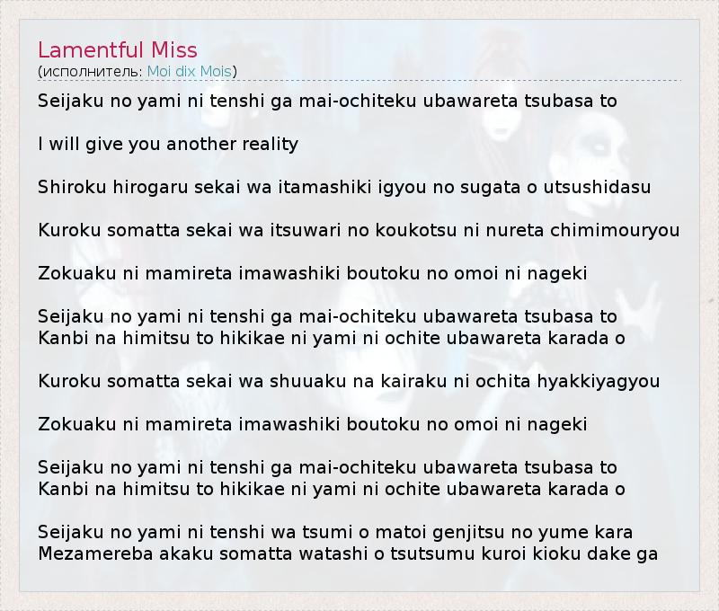 Seijaku no yami ni tenshi ga mai-ochiteku ubawareta tsubasa to I will give you another reality Shiroku hirogaru sekai wa itamashiki igyou no sugata o utsushidasu Kuroku somatta sekai wa itsuwari no koukotsu ni nureta chimimouryou Zokuaku ni mamireta imawashiki boutoku no omoi ni nageki Seijaku no yami ni tenshi ga mai-ochiteku ubawareta tsubasa to Kanbi na himitsu to hikikae ni yami ni ochite ubawareta karada o Kuroku somatta sekai wa shuuaku na kairaku ni ochita hyakkiyagyou Zokuaku ni mamireta imawashiki boutoku no omoi ni nageki Seijaku no yami ni tenshi ga mai-ochiteku ubawareta tsubasa to Kanbi na himitsu to hikikae ni yami ni ochite ubawareta karada o Seijaku no yami ni tenshi wa tsumi o matoi genjitsu no yume kara Mezamereba akaku somatta watashi o tsutsumu kuroi kioku dake ga
