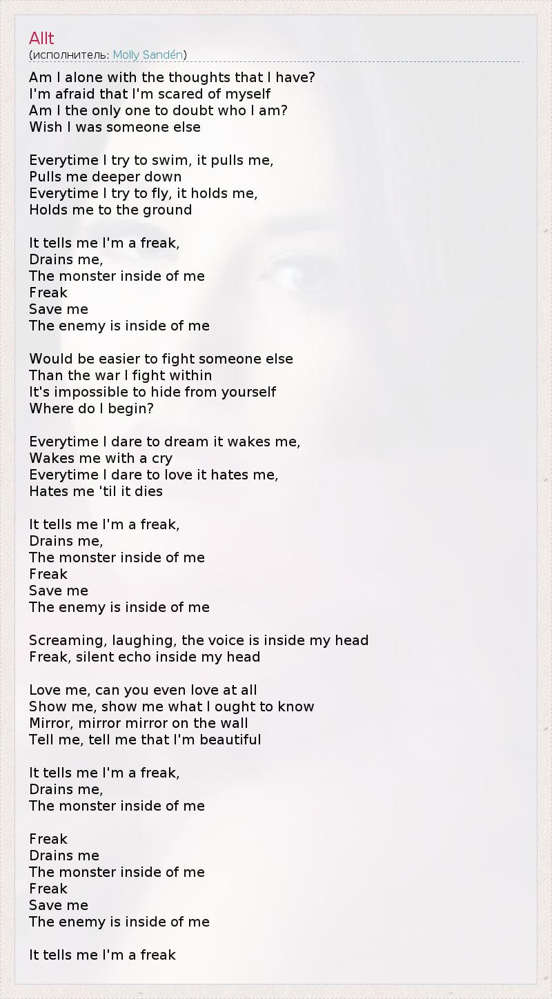 Am I alone with the thoughts that I have? I'm afraid that I'm scared of myself Am I the only one to doubt who I am? Wish I was someone else Everytime I try to swim, it pulls me, Pulls me deeper down Everytime I try to fly, it holds me, Holds me to the ground It tells me I'm a freak, Drains me, The monster inside of me Freak Save me The enemy is inside of me Would be easier to fight someone else Than the war I fight within It's impossible to hide from yourself Where do I begin? Everytime I dare to dream it wakes me, Wakes me with a cry Everytime I dare to love it hates me, Hates me 'til it dies It tells me I'm a freak, Drains me, The monster inside of me Freak Save me The enemy is inside of me Screaming, laughing, the voice is inside my head Freak, silent echo inside my head Love me, can you even love at all Show me, show me what I ought to know Mirror, mirror mirror on the wall Tell me, tell me that I'm beautiful It tells me I'm a freak, Drains me, The monster inside of me Freak Drains me The monster inside of me Freak Save me The enemy is inside of me It tells me I'm a freak