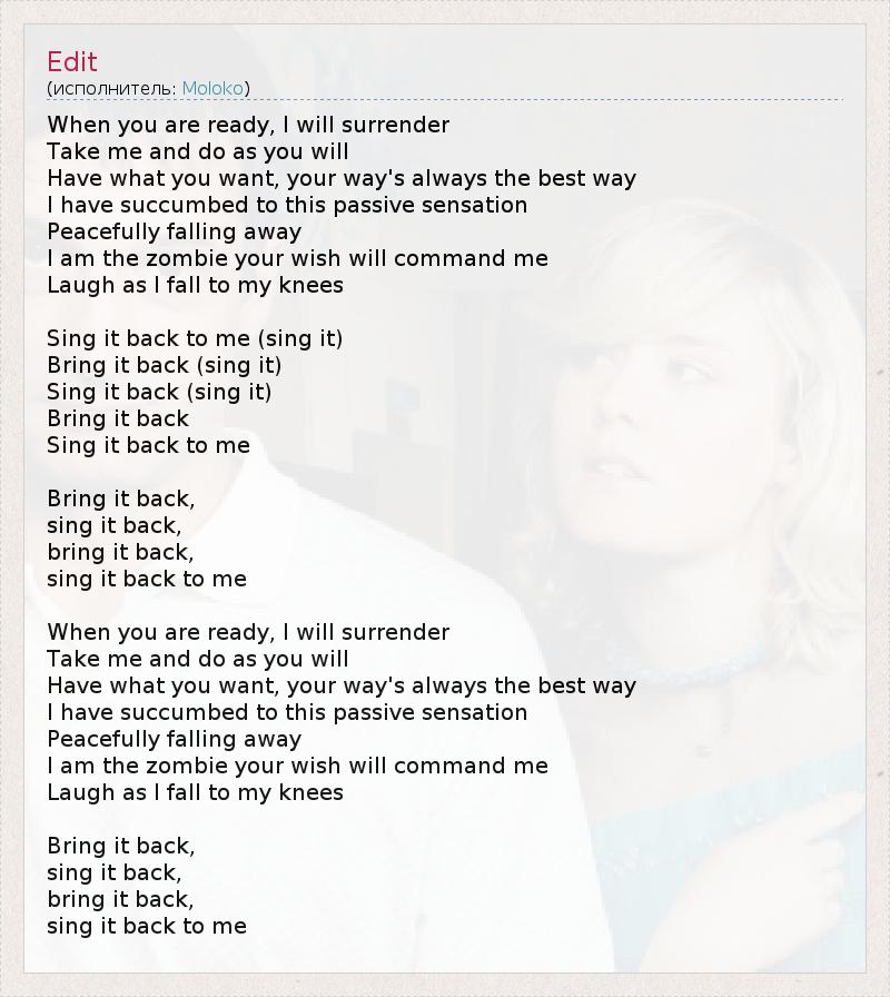 Это интересно:Moloko — британский музыкальный коллектив из Шеффилда, образован в 1994 году, распался в 2006. Состоял из композитора и инструменталиста Марка Брайдона (Mark Brydon) и вокалистки, автора текстов Ройшн Мёрфи (Róisín Murphy).Название группы происходит из сленга "надцатых" из романа "Заводной апельсин" ("A Clockwork Orange"), в котором... продолжение