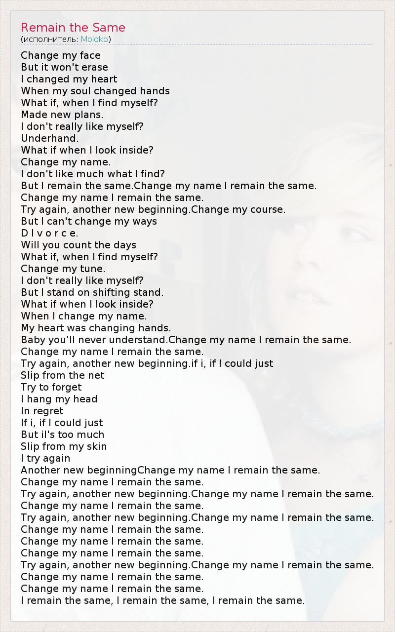 Change my face But it won't erase I changed my heart When my soul changed hands What if, when I find myself? Made new plans. I don't really like myself? Underhand. What if when I look inside? Change my name. I don't like much what I find? But I remain the same.Change my name I remain the same. Change my name I remain the same. Try again, another new beginning.Change my course. But I can't change my ways D I v o r c e. Will you count the days What if, when I find myself? Change my tune. I don't really like myself? But I stand on shifting stand. What if when I look inside? When I change my name. My heart was changing hands. Baby you'll never understand.Change my name I remain the same. Change my name I remain the same. Try again, another new beginning.if i, if I could just Slip from the net Try to forget I hang my head In regret If i, if I could just But il's too much Slip from my skin I try again Another new beginningChange my name I remain the same. Change my name I remain the same. Try again, another new beginning.Change my name I remain the same. Change my name I remain the same. Try again, another new beginning.Change my name I remain the same. Change my name I remain the same. Change my name I remain the same. Change my name I remain the same. Try again, another new beginning.Change my name I remain the same. Change my name I remain the same. Change my name I remain the same. I remain the same, I remain the same, I remain the same.