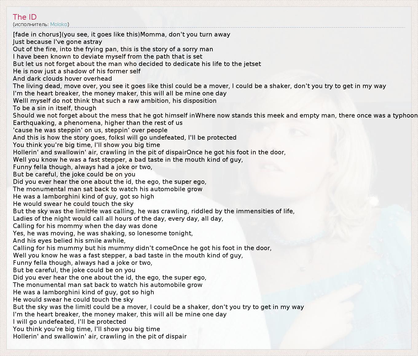 Это интересно:Moloko — британский музыкальный коллектив из Шеффилда, образован в 1994 году, распался в 2006. Состоял из композитора и инструменталиста Марка Брайдона (Mark Brydon) и вокалистки, автора текстов Ройшн Мёрфи (Róisín Murphy).Название группы происходит из сленга "надцатых" из романа "Заводной апельсин" ("A Clockwork Orange"), в котором... продолжение