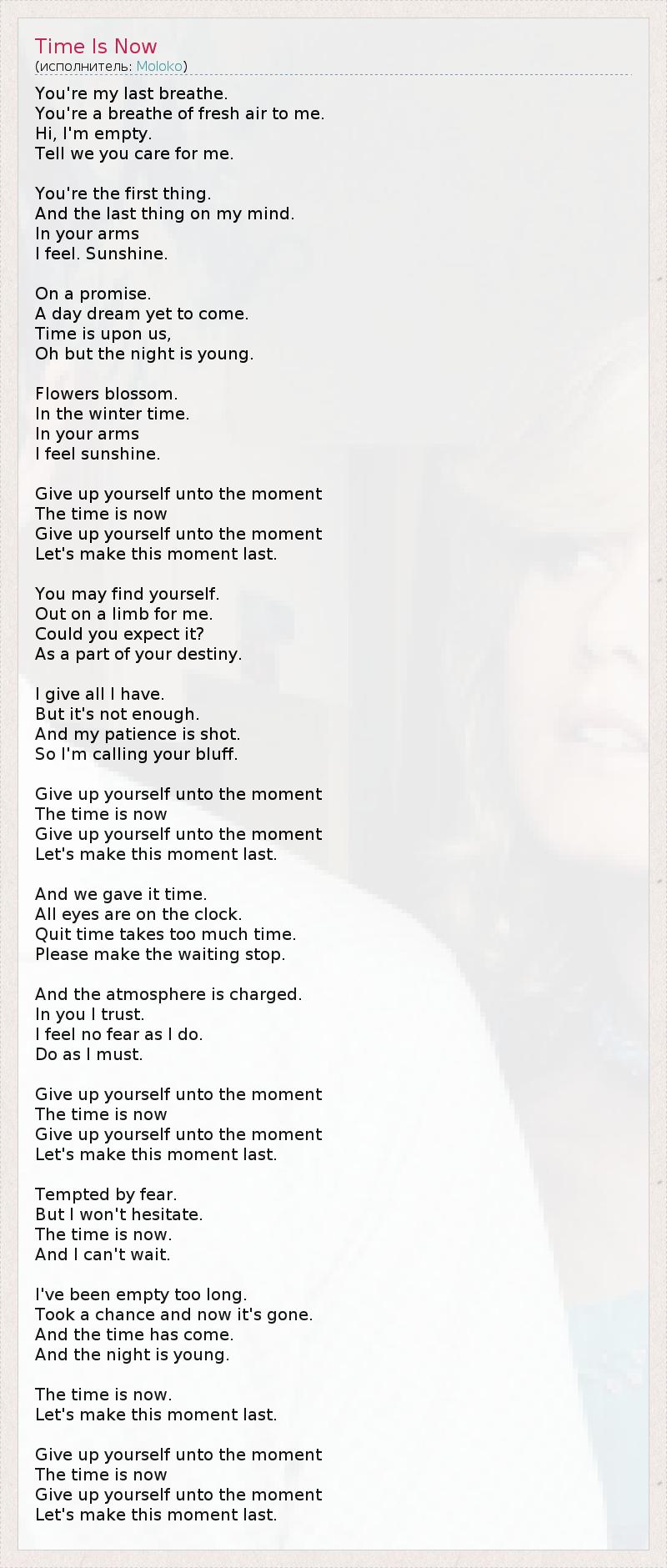 You're my last breathe. You're a breathe of fresh air to me. Hi, I'm empty. Tell we you care for me. You're the first thing. And the last thing on my mind. In your arms I feel. Sunshine. On a promise. A day dream yet to come. Time is upon us, Oh but the night is young. Flowers blossom. In the winter time. In your arms I feel sunshine. Give up yourself unto the moment The time is now Give up yourself unto the moment Let's make this moment last. You may find yourself. Out on a limb for me. Could you expect it? As a part of your destiny. I give all I have. But it's not enough. And my patience is shot. So I'm calling your bluff. Give up yourself unto the moment The time is now Give up yourself unto the moment Let's make this moment last. And we gave it time. All eyes are on the clock. Quit time takes too much time. Please make the waiting stop. And the atmosphere is charged. In you I trust. I feel no fear as I do. Do as I must. Give up yourself unto the moment The time is now Give up yourself unto the moment Let's make this moment last. Tempted by fear. But I won't hesitate. The time is now. And I can't wait. I've been empty too long. Took a chance and now it's gone. And the time has come. And the night is young. The time is now. Let's make this moment last. Give up yourself unto the moment The time is now Give up yourself unto the moment Let's make this moment last.